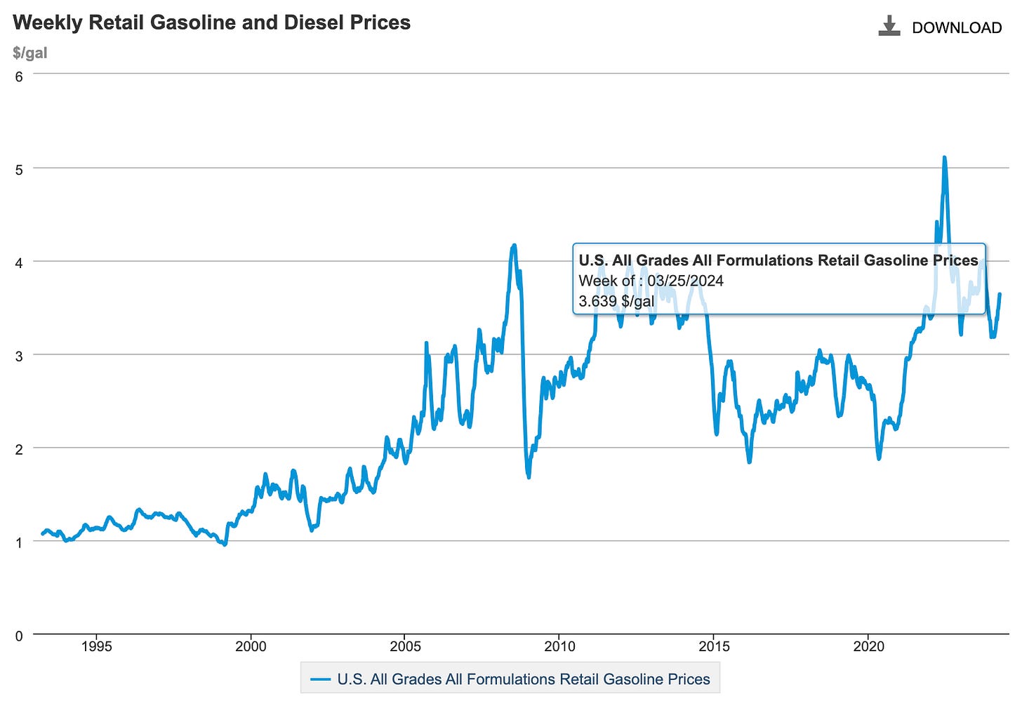 As expected, along with the rise in Crude prices, gasoline prices have rebounded since bottoming out in December 2023. Several factors, ranging from underlying demand increasing for Crude to the IEA’s energy outlook upgrade. To further add, airstrikes on Russian refineries by Ukraine and refineries entering maintenance season have all contributed to prices on Brent & WTI being up 17% and 14% respectively.