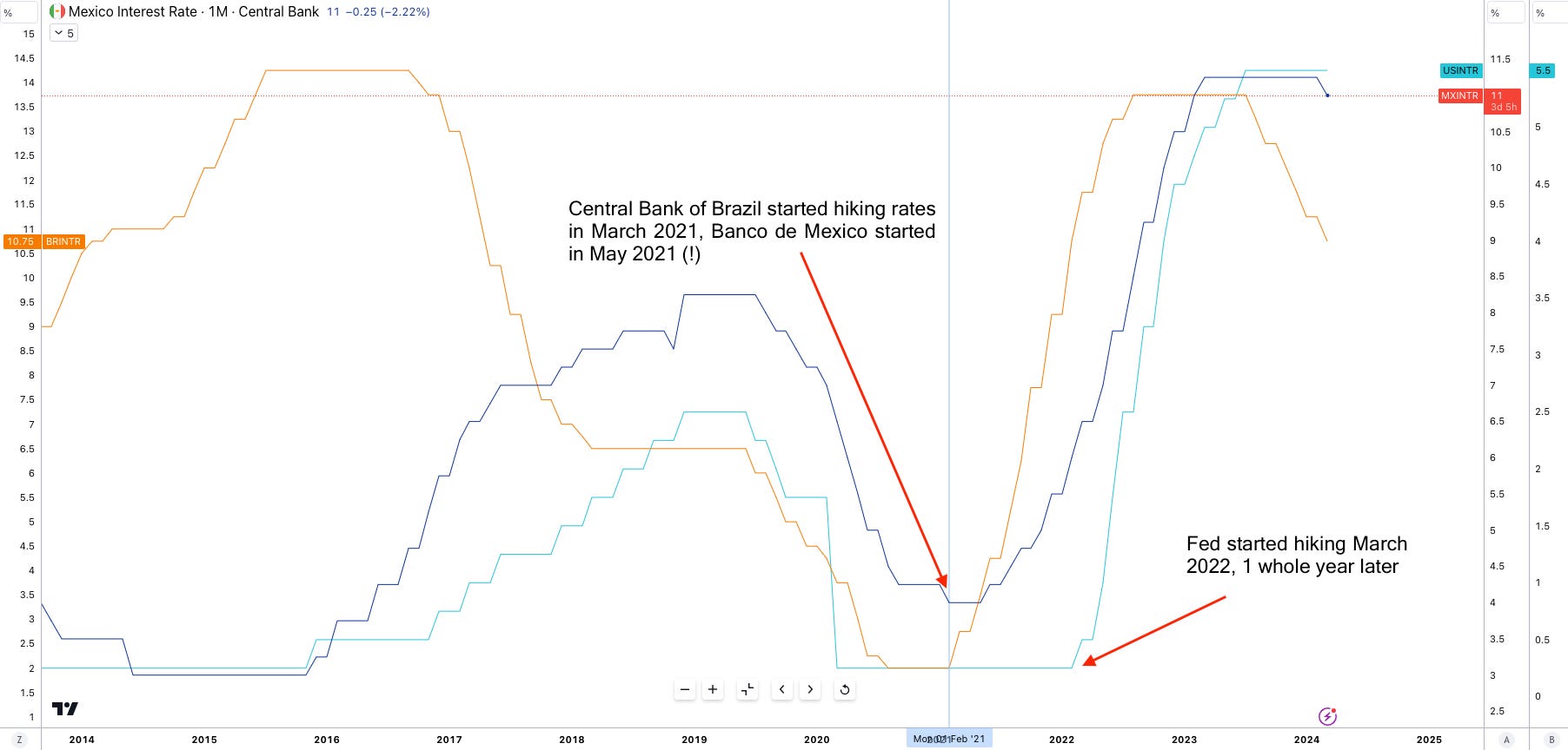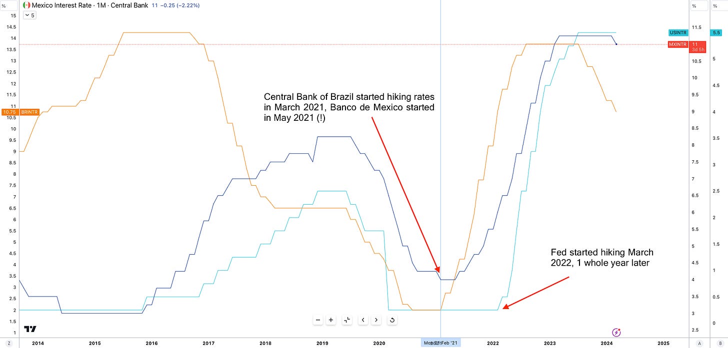 Many EM central banks, particularly in Latin America (LatAm), started raising interest rates 9-13 months before the Federal Reserve. This "frontrunning" strategy aims to insulate their currencies from capital flow volatility that can disrupt both fiscal and monetary policy goals.