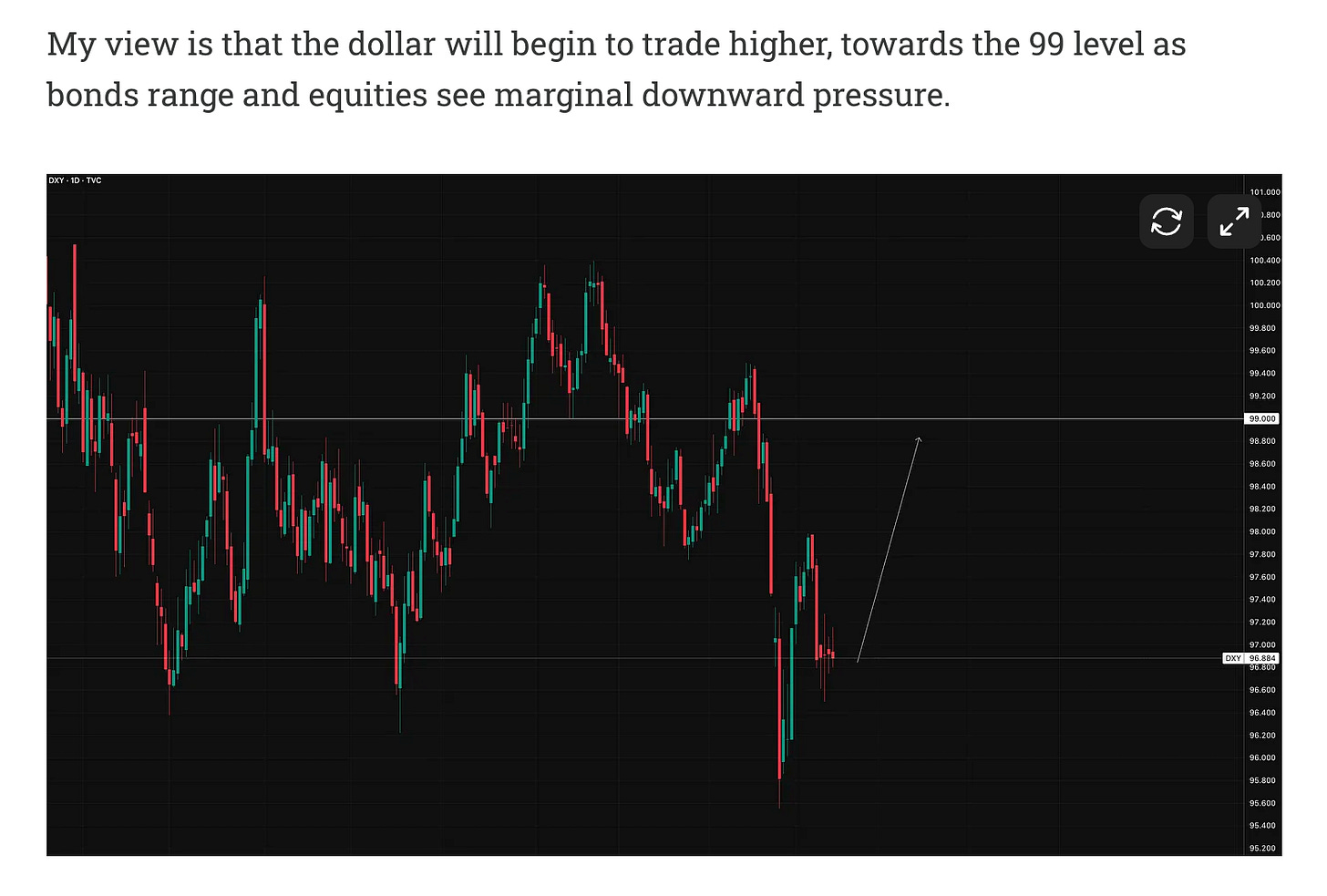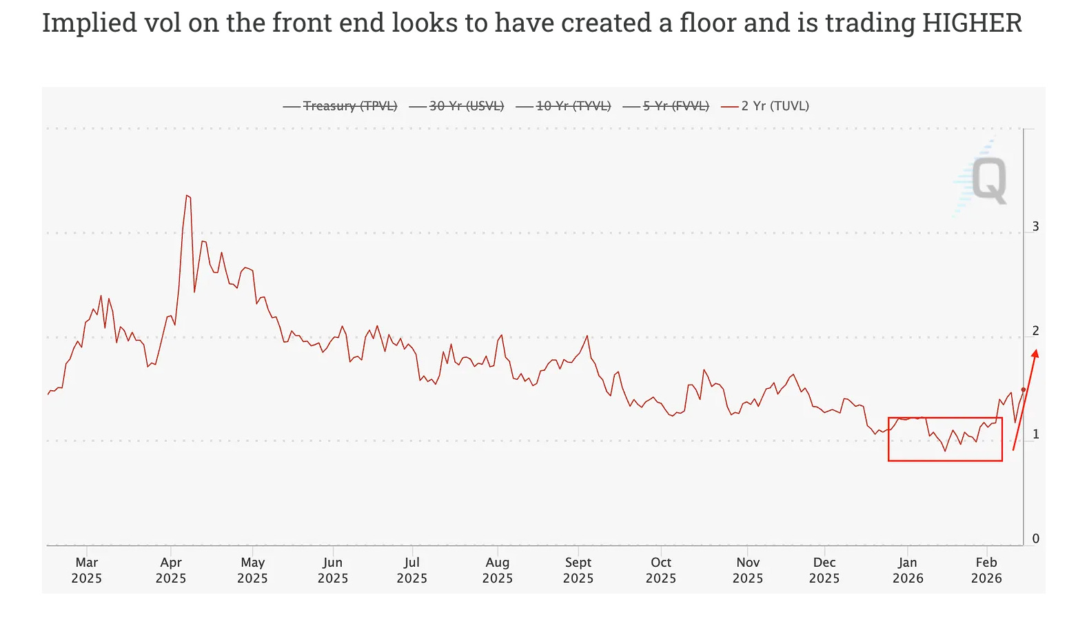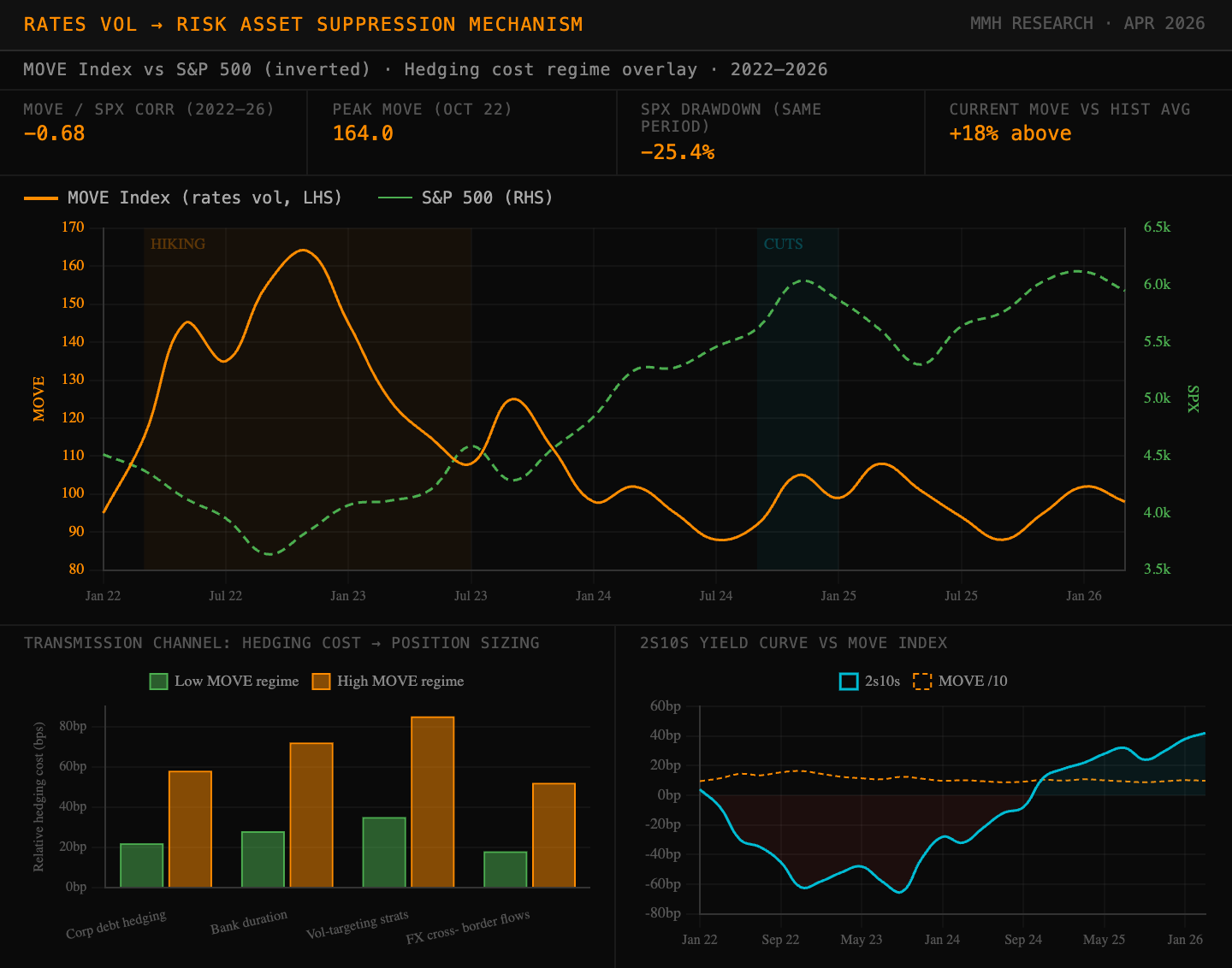 Rates volatility is the parent asset class for everything else. When implied vol in bonds is elevated, it means there is real uncertainty about where short and long rates are going. That uncertainty does NOT stay in the bond market. It bleeds into FX implied vols, which bleed into equity implied vols, which ultimately determine how risk assets are priced across the whole spectrum (look at the visual at the top of the report on this connection: rates > FX > equities). Rates are the heart of ALL markets in my view, equities are just a function of what rates and FX are doing.