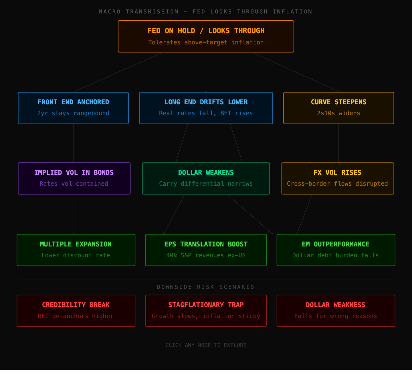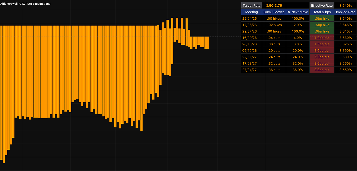 So I want to begin with a scenario about what could actually happening here. The Fed is sitting with rates at 3.75% with short-term inflation swaps running above target and energy prices being pushed around by the Middle East. There is more risk of persistent above-target inflation throughout 2026 and yet the forward curve is beginning to shift back towards pricing a probability of cuts this year which will likely get more aggressive in repricing as we progress through this cross-asset implied vol/geopolitical premium unwind.