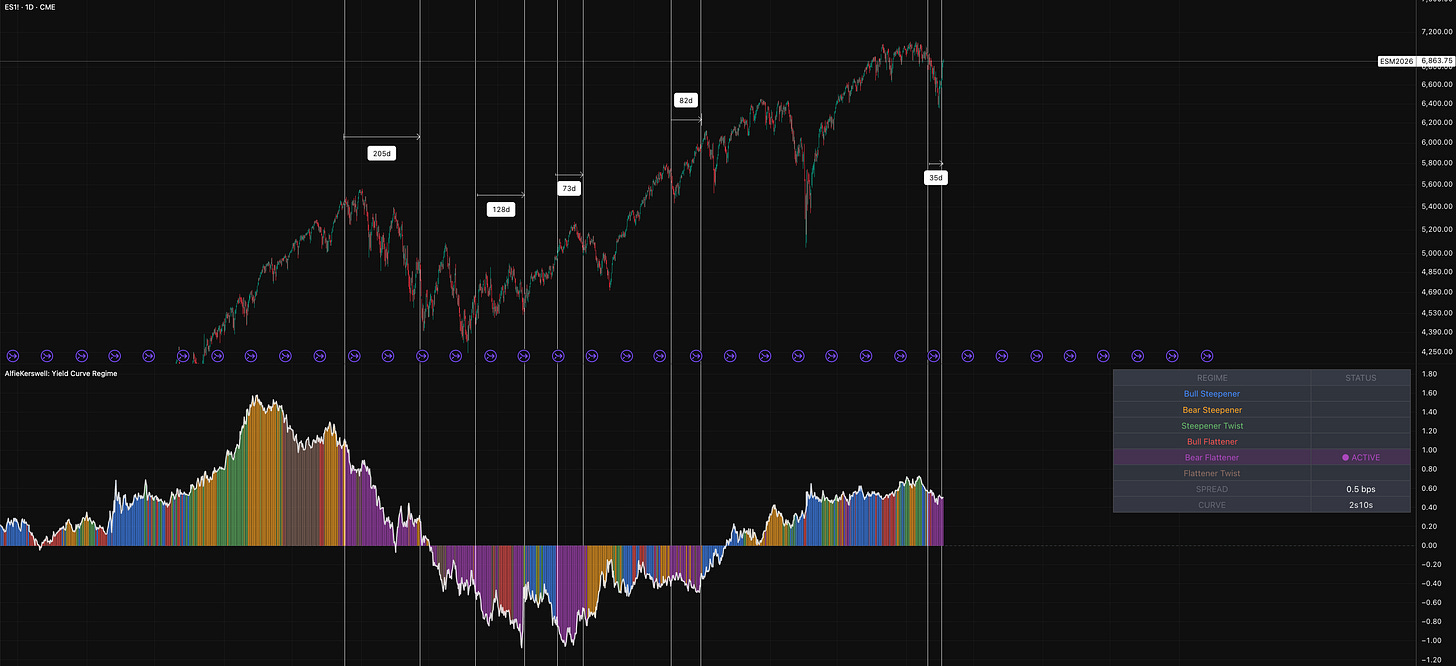 Bear steepening is NOT friendly for equities. It’s the rates regime where you get rising long rates that are signaling credibility concerns, which is a COMPLETELY different transmission mechanism than what most equity investors are pricing in. ES struggles in most 2s10s bear flattening regimes: