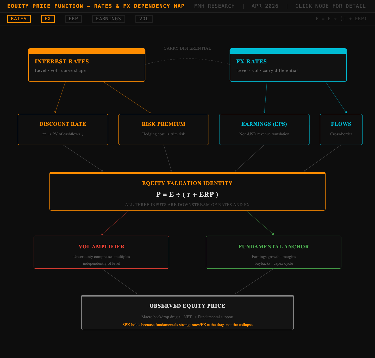 The transmission from FX vol into equity vol is slightly less reflexive. When currencies are moving aggressively, the earnings uncertainty for multinationals with significant non-dollar revenues or costs expands MASSIVELY. A big unexpected move in EURUSD or USDJPY in a quarter can swing EPS outcomes by hundreds of basis points for large cap exporters. That earnings uncertainty gets priced into equity implied vol, and elevated equity vol suppresses valuations through the discount rate and risk premium channels simultaneously.