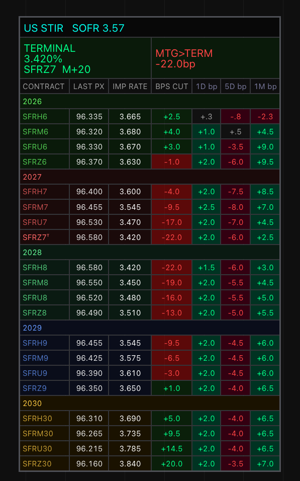 The Dec26 contract has a bunch of vol running through it, you can see this in the open interest if you go to the CME website. So if you’re trading the forward curve directly you want to be most exposed to Dec26-Mar27 in my view. It was only last month we had the terminal rate sitting in the Sep27 contract, and in my view I think it probably stays there because even if we get repricing of the curve (likely), I think it’s unlikely that the terminal is brought forward because that’d be a little extreme considering the backdrop (if they’re going to cut into inflation, they’ll do it slowly). So I think we’re likely to see a shift in the terminal rate from Z7 to U7 at best.