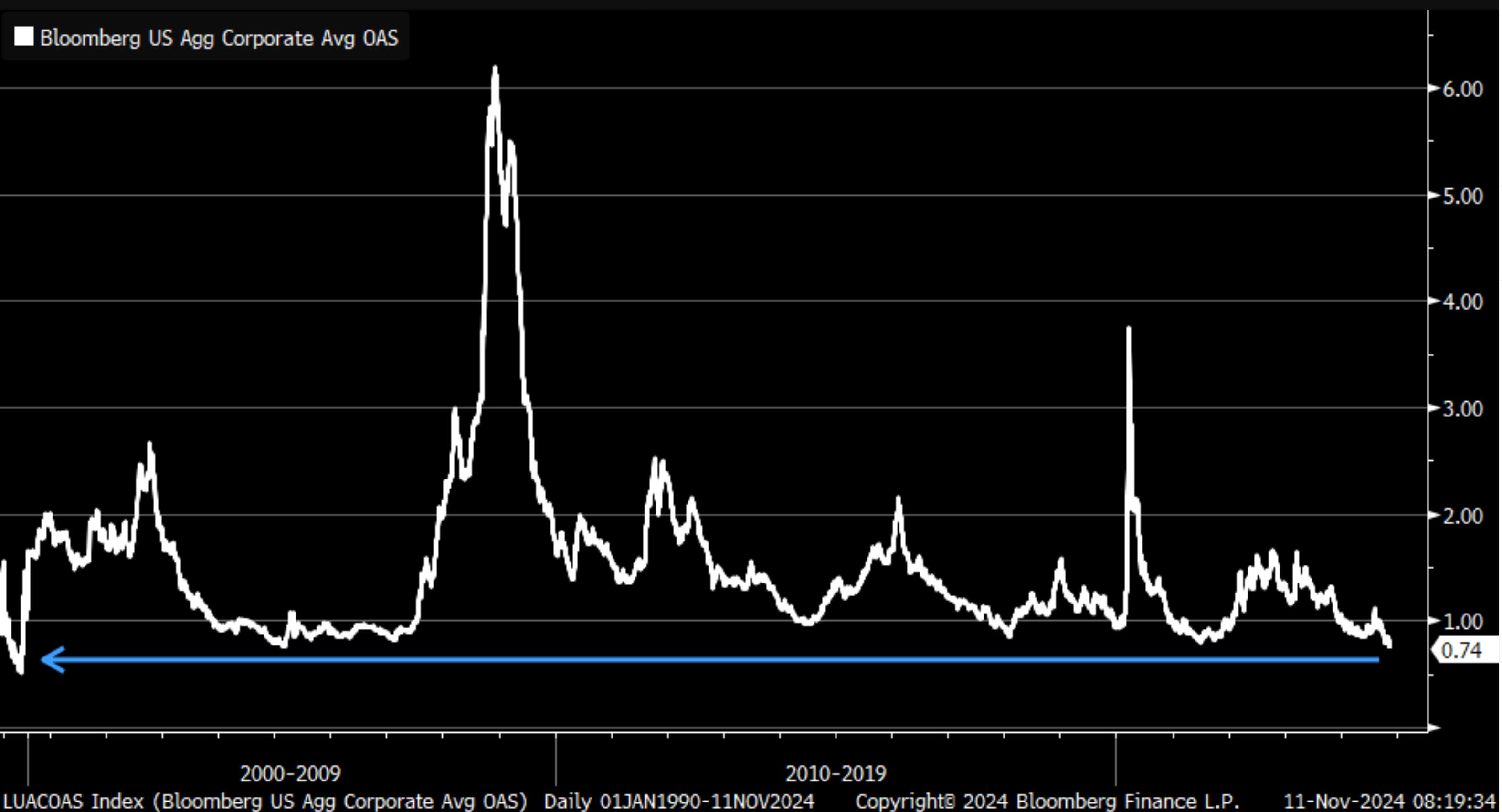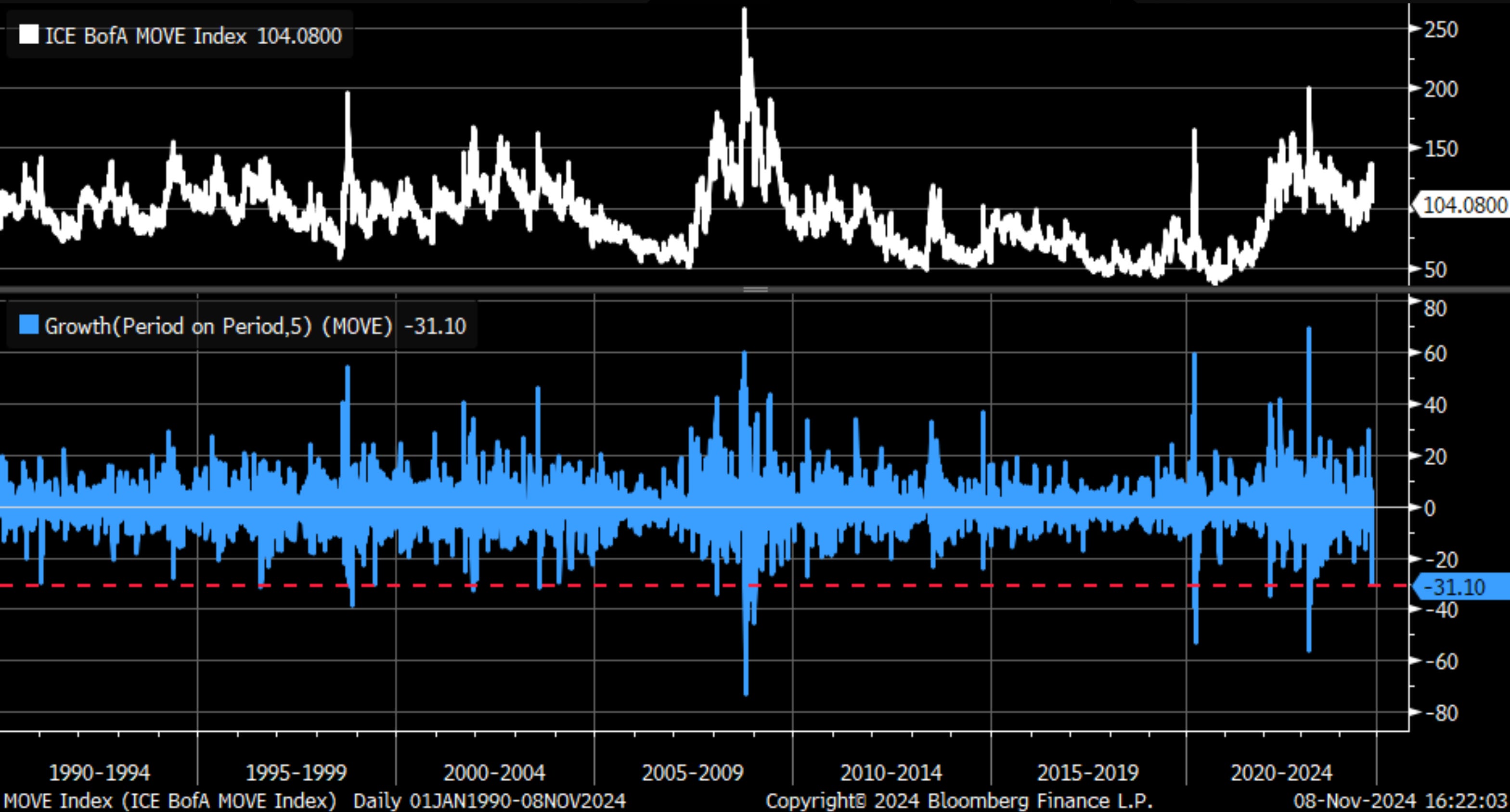 The MOVE Index has fallen by c.31.1 points over the past 5 days, that is one of the larger declines in history (going back to 1990). Of course, we expected a drop off in volatility once the dust had settled from the elections, but the decline is one of the largest in history. As mentioned in my last report, there’s a high probability that we’ll see continued upward pressure on yields as Trump’s inflationary policies take power. These higher yields will naturally shift sentiment and credit spreads will likely be tight for a while, signalling some great strength.