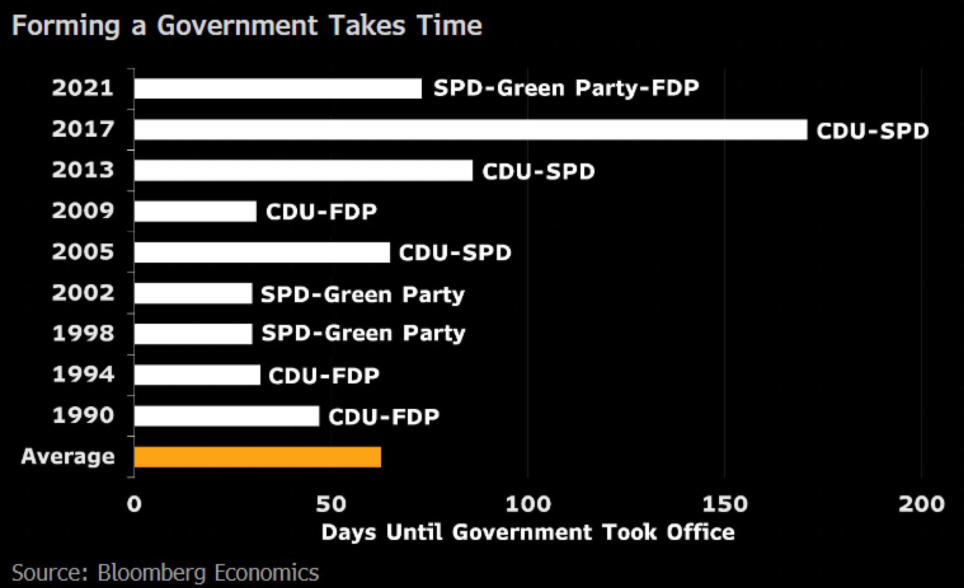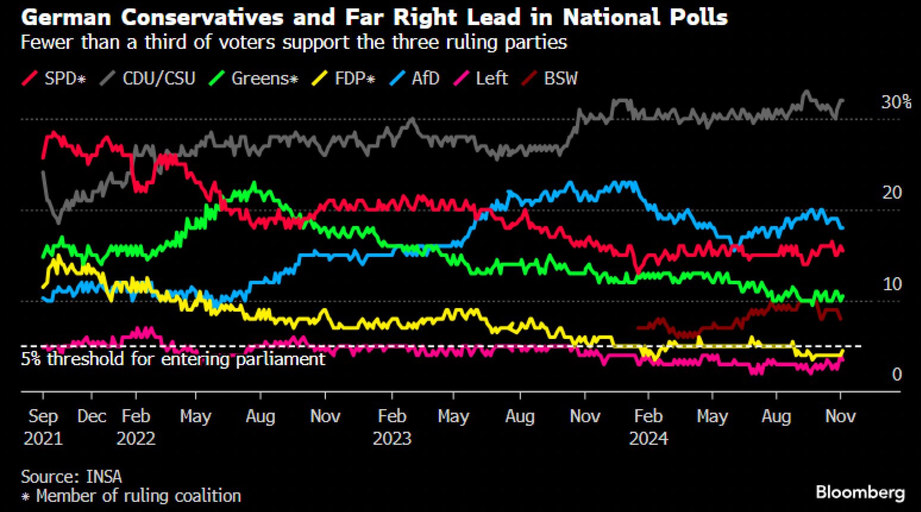Chancellor Olaf Scholz said he’s open to moving up a parliamentary confidence vote to before Christmas, which could bring the early election forward to February. Germany could have a new leadership by April if a new government is formed in the usual timeline. This would leave the country without a fully functioning government for 6 months after the break-up of the traffic light coalition (the combination of all 3 political parties: SPD, FDP & The Green Party).