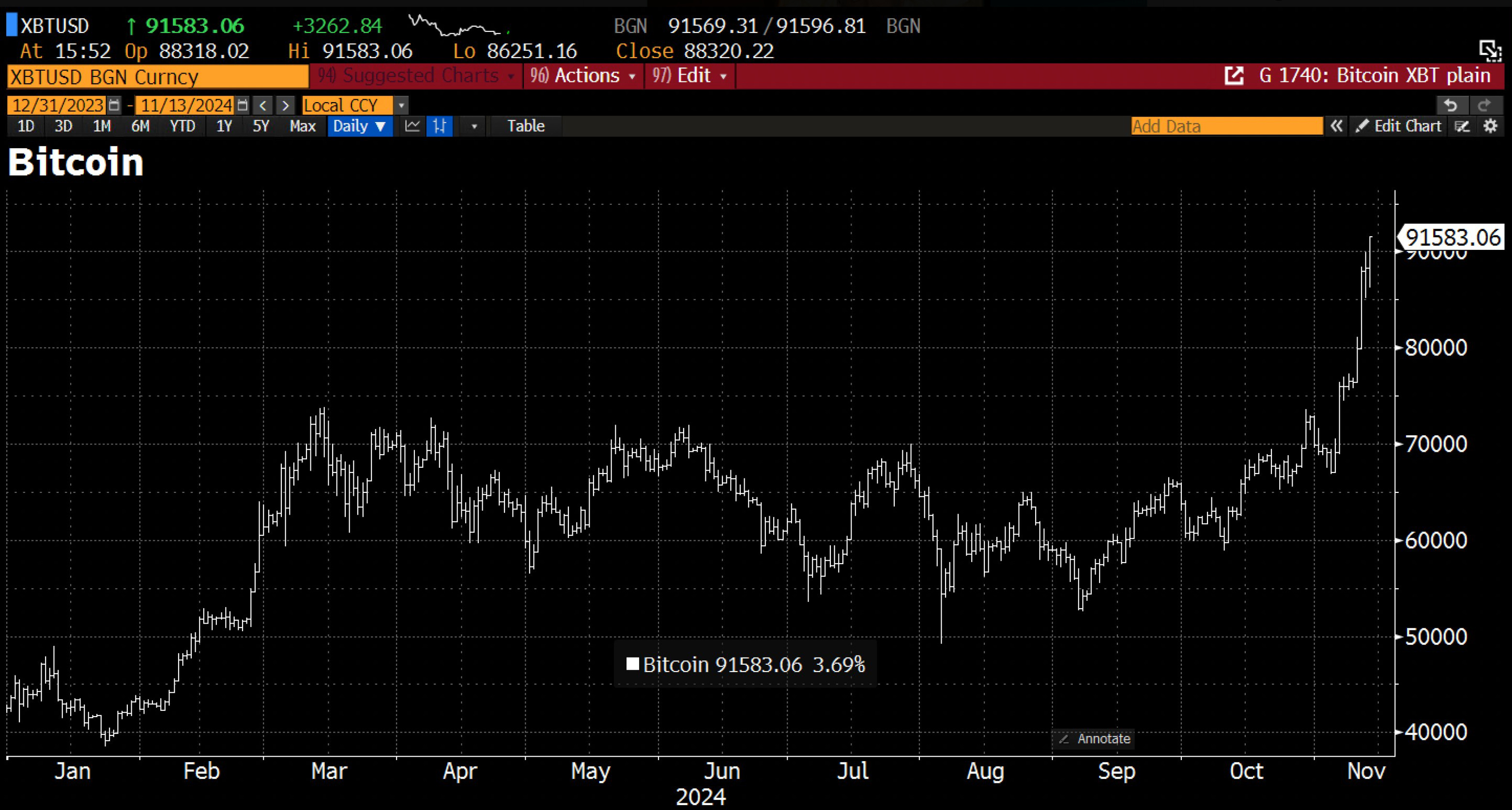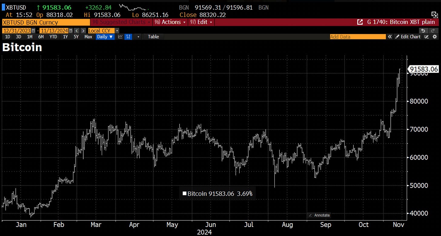It’d be hard to not talk about the c.32% gain in Bitcoin since Trumps election last Wednesday. The $93,000 level was breached, taking the Bitcoin market cap to c.$1.8trn as the rally in risk assets resumes on Trump optimism.