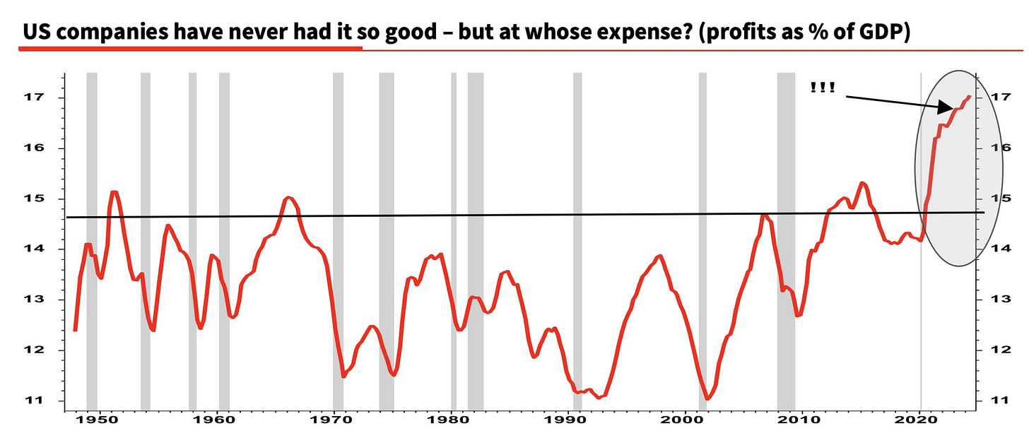 U.S. companies have never had it so good, the profit share of U.S. GDP has hit a record c.17%. This partly explains why the average American feels poorer today (to an extent, I’m not ignoring the fact that the U.S. has had mass money printing and high inflation which has contributed to a poorer-feeling American), than 4 years ago - c.40% of Americans don’t own any stocks. I think there’s going to be large fluctuations in portfolios across quarters, with extra risk taking being favoured because of the regimes in play. Ease of access to capital will further pump the trend of risk in portfolios, a defensive portfolio makes little sense in this times. Yes, rates are high, but once again it’s another thing that we may see a shift in - Investors taking the risk that they can outperform rates so significantly that borrowing at these levels is not detrimental to their returns. Accelerating growth and restrictive policy is the regime in play here, time to position.