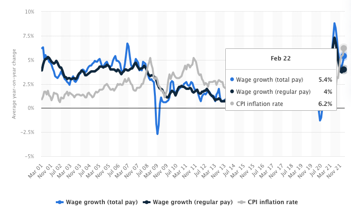 Wage growth vs CPI. Data coming out yesterday showed UK average earnings+bonuses grew by 7.0% YoY in March. Now, for the month of March, the ONS recorded a CPI reading of 7%, side note, the real figure is actually higher than that, showing that overall there was no true increase in personal income across the UK, rather wage growth managed to keep up mostly in the financial sector which contributes most for bonuses.