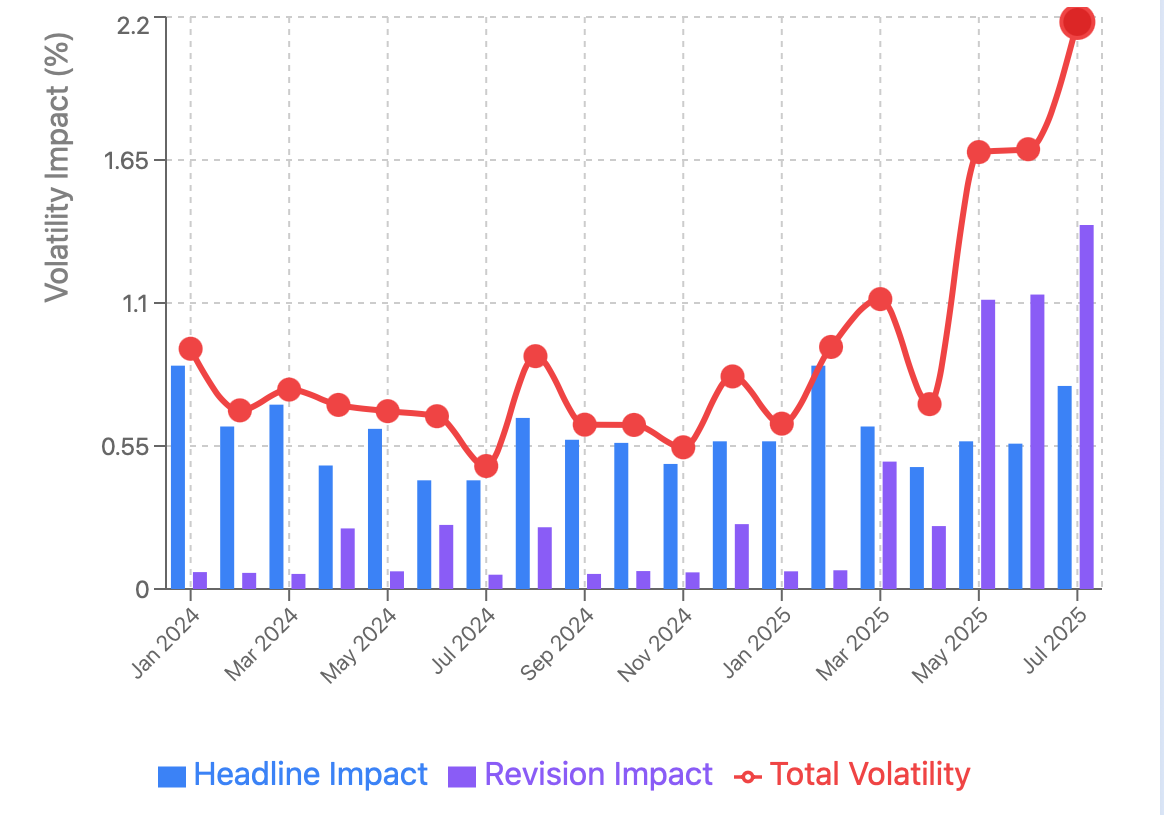 Our analysis of the last 19 months of Payroll data reveals that revisions drive < c.30% of average DXY vol around release day, however July's historic revision accounted for c.75% of the DXY's violent c.1.72% daily swing compared to just c.25% from the headline number. This represents a complete paradigm shift from traditional market wisdom that treated revisions as statistical housekeeping, creating a new reality where corrections of this magnitude can eclipse headline surprises in market impact.