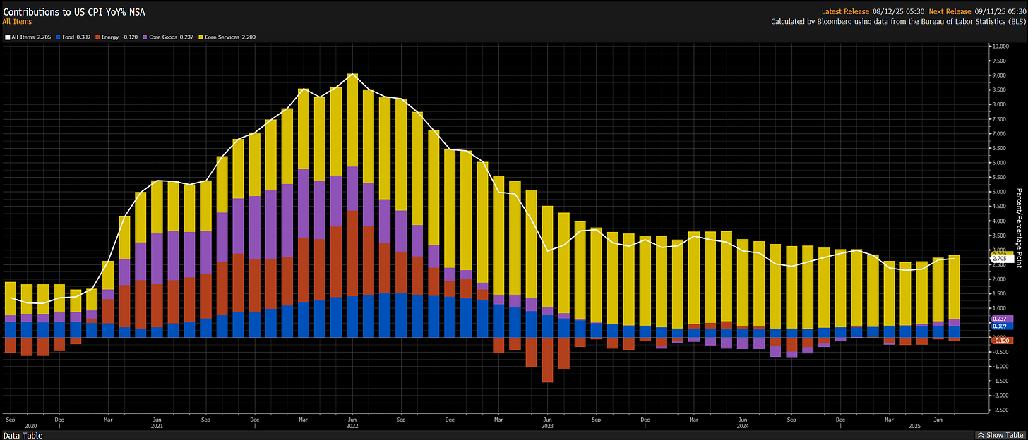 The doves see crippled employment force evident from recent revision in last two months reading (258k) as 3 months average hovers the 35k mark and the hawks argue UR at record lows validating the balanced view as the country and business adjust to immigration policies. Regardless of your view on the labour market it is getting increasingly harder to ignore that the inflationary impulse from the tariffs set in place Q2 of this year.