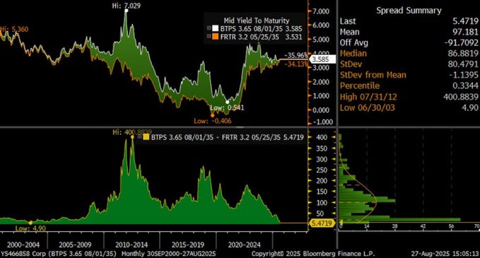 The immediate pressure comes from the French, where PM Bayrou faces a confidence vote next month that could destabilise an already fragmented parliament. With the Eurozone’s widest public deficit and entrenched political divisions France is fast becoming a risk premium driver for the bloc. This was the main guage for the bloc stress this past week