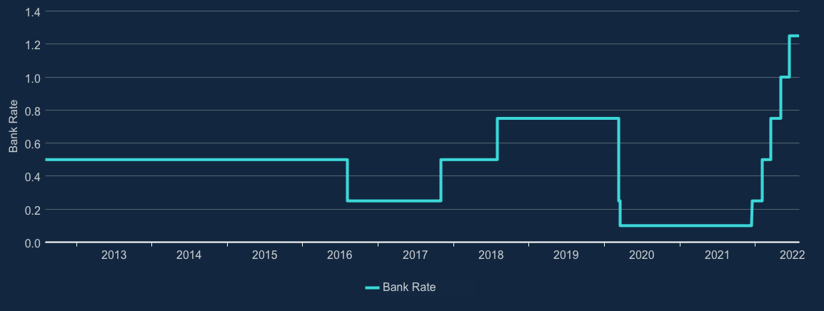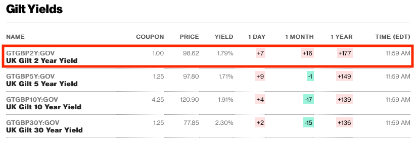 Currently, the base rate is sitting at 1.25% across the Uk with markets pricing in a hike of 50bps today at noon. Now, something I’ve been paying a bit more attention to is the bond market, mainly because it’s frankly a great forward-looking lense on where investors price rates to be in the future.
