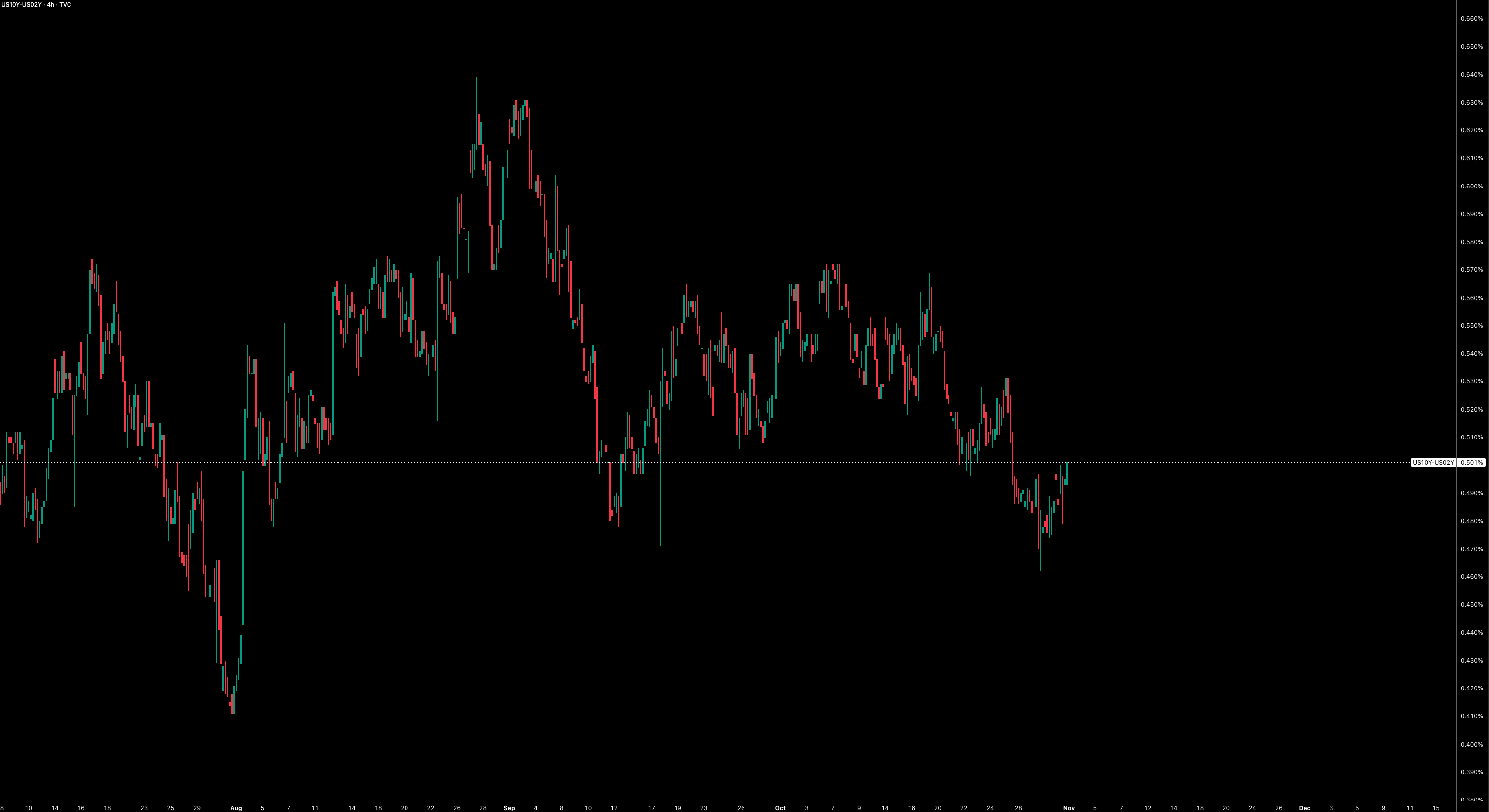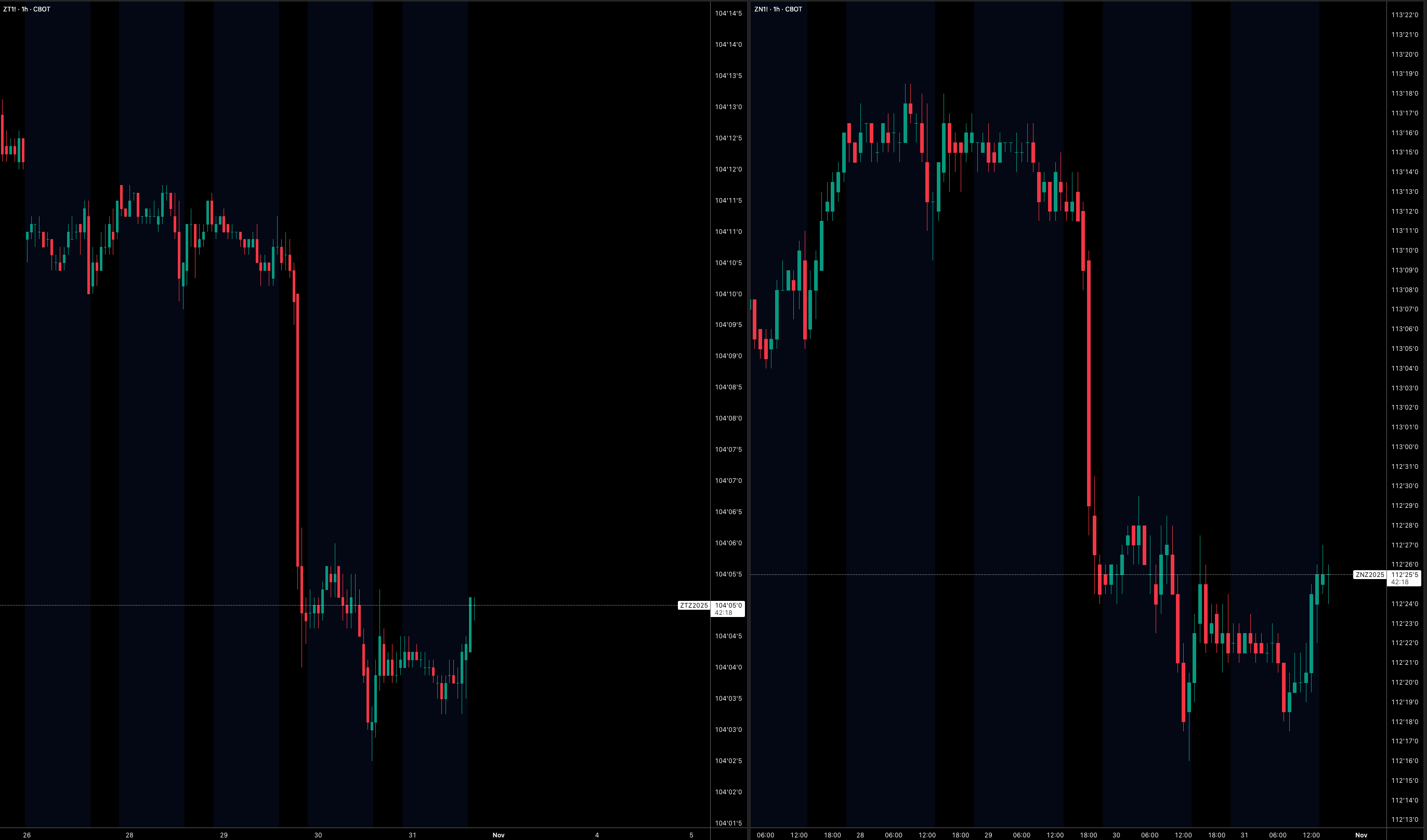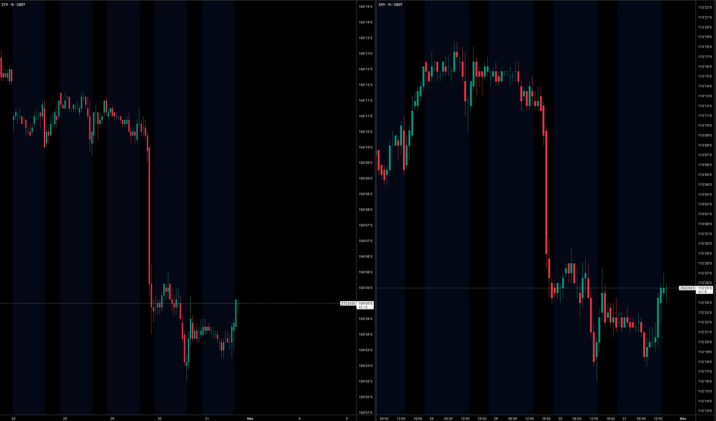 The 2y was hit harder than the 10y for a simple reason: even though the Fed delivered a 25bps cut, Powell pushed back on expectations of further easing, emphasising that December is not a “foregone conclusion.” It was effectively a hawkish cut, signaling that the Fed is no longer validating the degree of easing markets have priced in, as it once did. As a result, traders reduced bets on near-term cuts, pushing up 2y rates up (and driving ZT lower), since that part of the curve is most sensitive to the expected path of Fed Funds over the next few meetings.