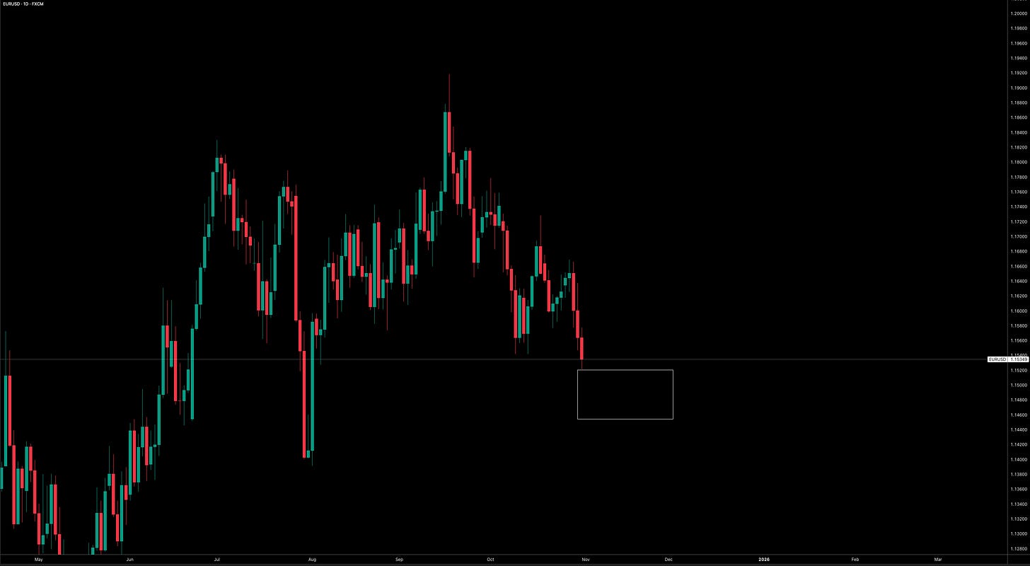 I’ll be closely monitoring how EUR/USD trades over the next two weeks in the box below. Ideally, I’d like to see eurozone rates start to firm into year-end. If November inflation prints in the U.S. lower again, alongside a decline in inflation swaps, I think the December and January cuts could become fully priced in. That said, I’m not abandoning my broader bias that the Fed will eventually need to step back onto the curve due to persistent inflation and strong growth; I’m simply framing this near-term view around how reactive the OIS curve has been to softer data.