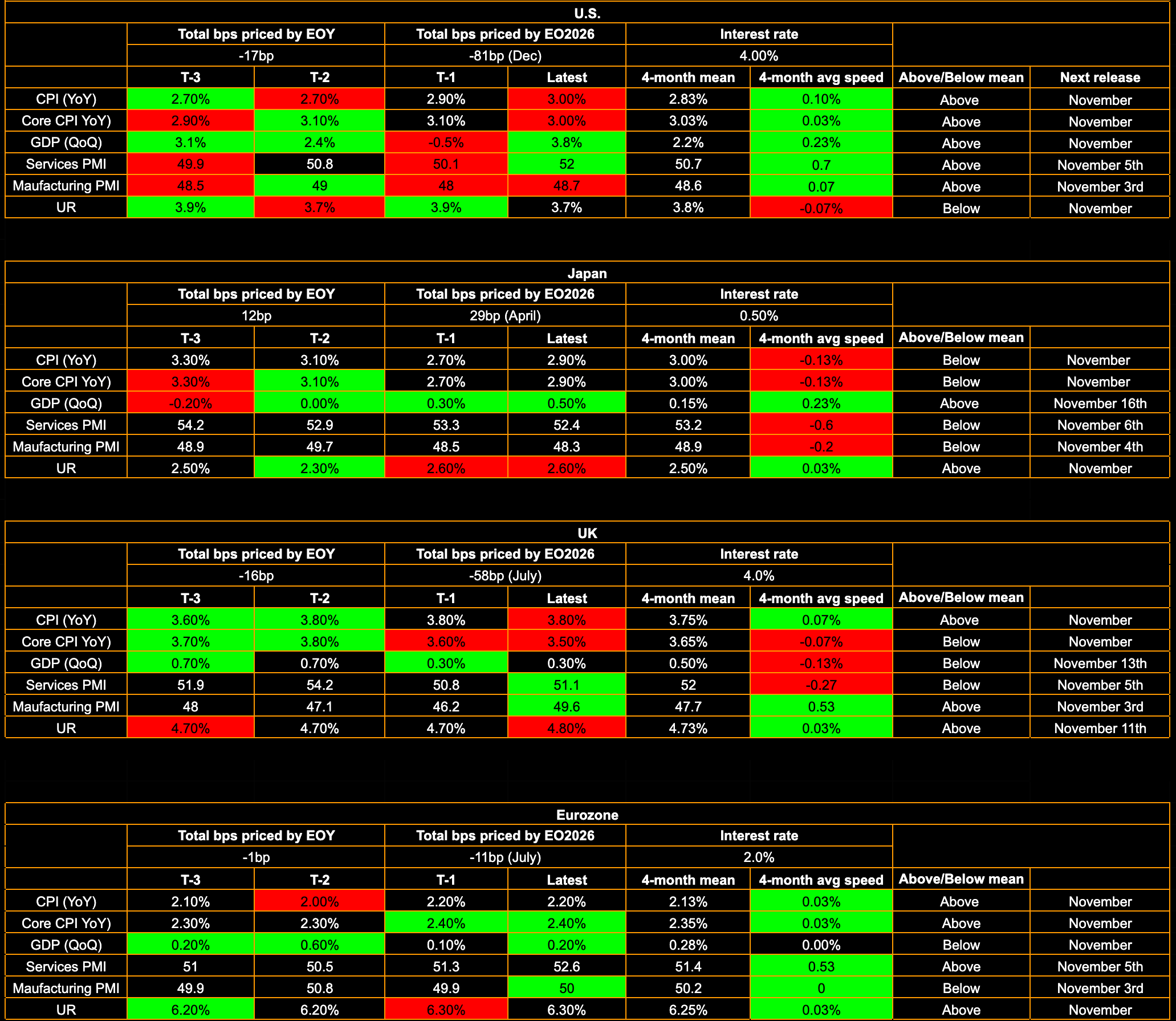 So why is the 2s10s curve flattening even though growth and inflation remain strong while the Fed is cutting into that strength? The answer lies in the front end holding firm as OIS reprices slightly after Powell’s hesitation to confirm a December cut. At the same time, inflation has been easing, and although it’s still expected to stay above the Fed’s target, markets are responding to softer inflation swaps and metrics across the board. There’s also an element of policy risk being priced in: if investors believe the Fed may be making a policy mistake that could require re-tightening later, longer-term growth expectations begin to weaken, pulling 10y rates lower and contributing to the flattening.