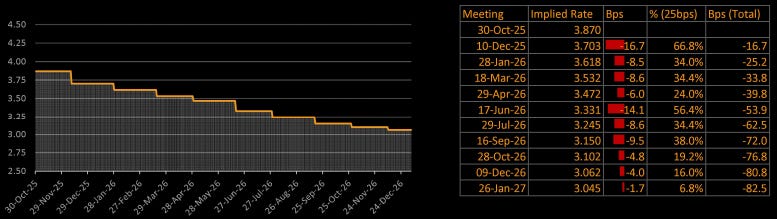 Looking at the OIS curve, rate cut expectations have been pared back, though only modestly. Markets now assign about a 65% probability of a December cut, down from what was an almost certain 25bps move before Powell’s remarks.