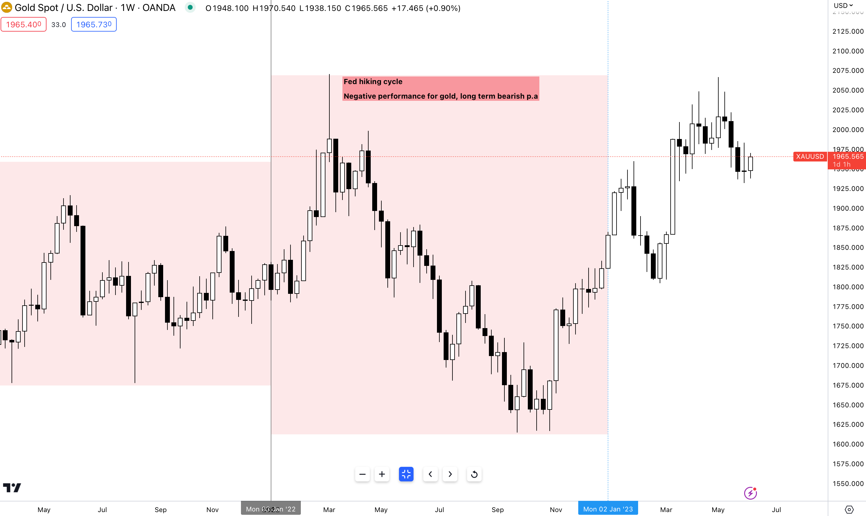 So as a trader, you now are able to understand that in an environment where central banks are raising rates, you would want to be short gold on the higher long-term play, as that would be the predominant trend, seen in March 2022 when the Fed began their 16-month hiking cycle.