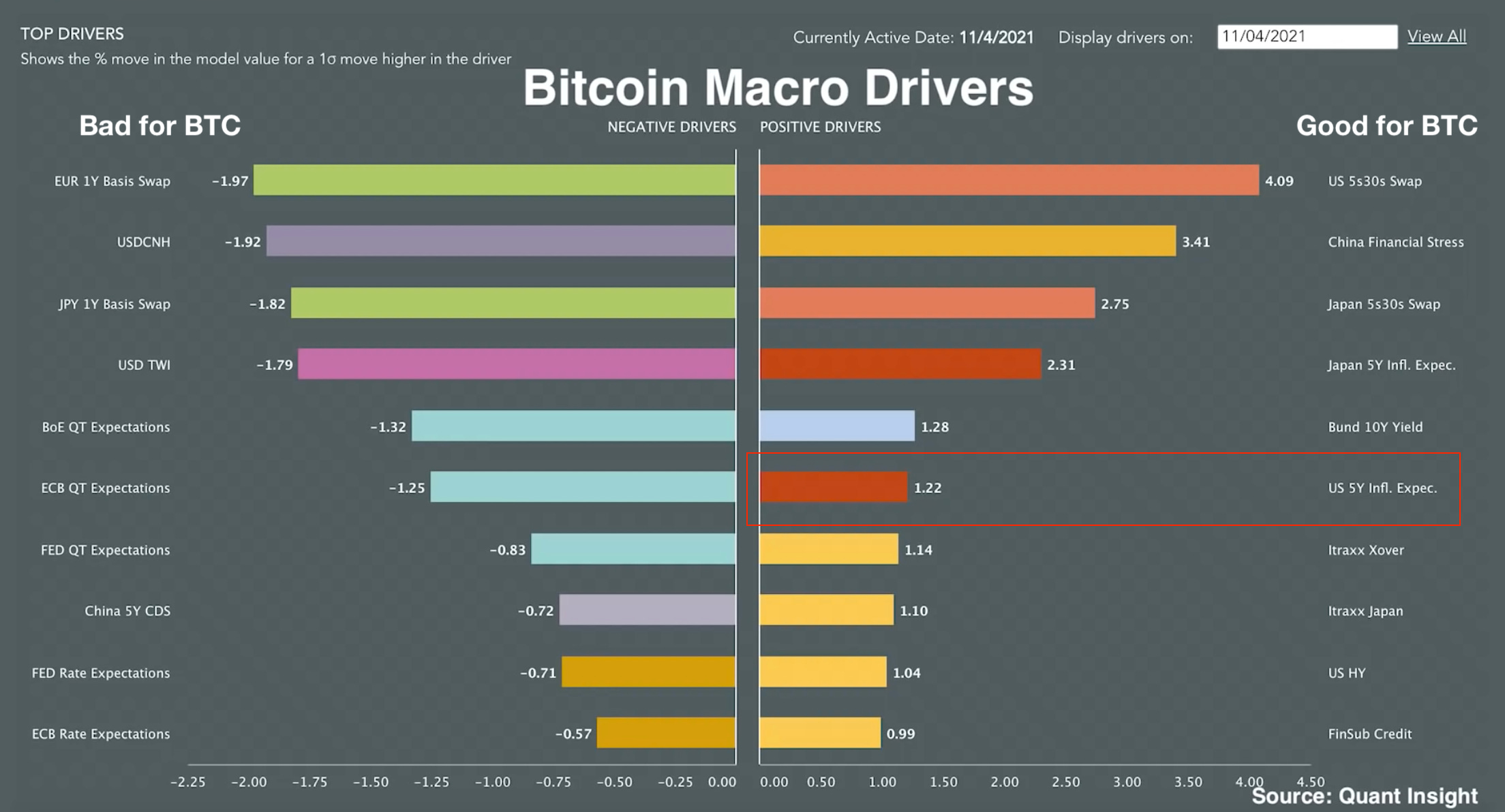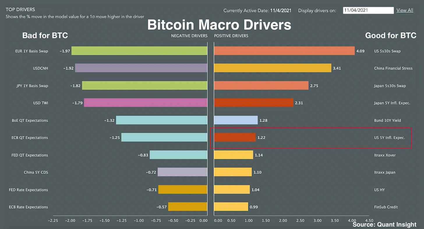 The factors listed to the right are positive macro drivers for BTC, meaning that when any of these individual occurrences are in play, this has a positive impact on the price of Bitcoin, the opposite is true for the factors to the left, you can see that QT is clearly a negative driver of BTC. Whereas, the highlighted US 5Y inflation expectations, a forward projection of U.S inflation over the next 5 years, drive the asset price higher. So in an environment where future inflation is expected to continue climbing the price of BTC tends to perform well suggesting its positive relationship to inflationary periods.