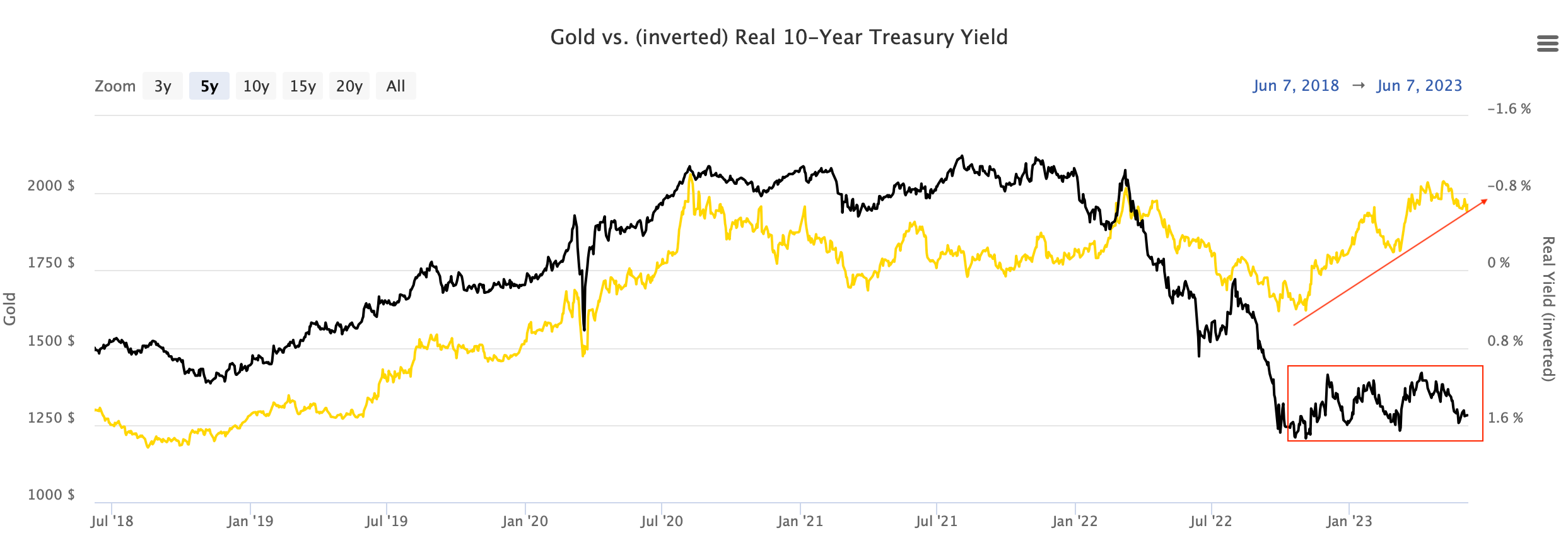 Real rates represent the opportunity cost for holding the yellow metal, an asset which yields nothing. So the higher real rates are, the higher the opportunity cost for holding gold, so the lower price for gold.