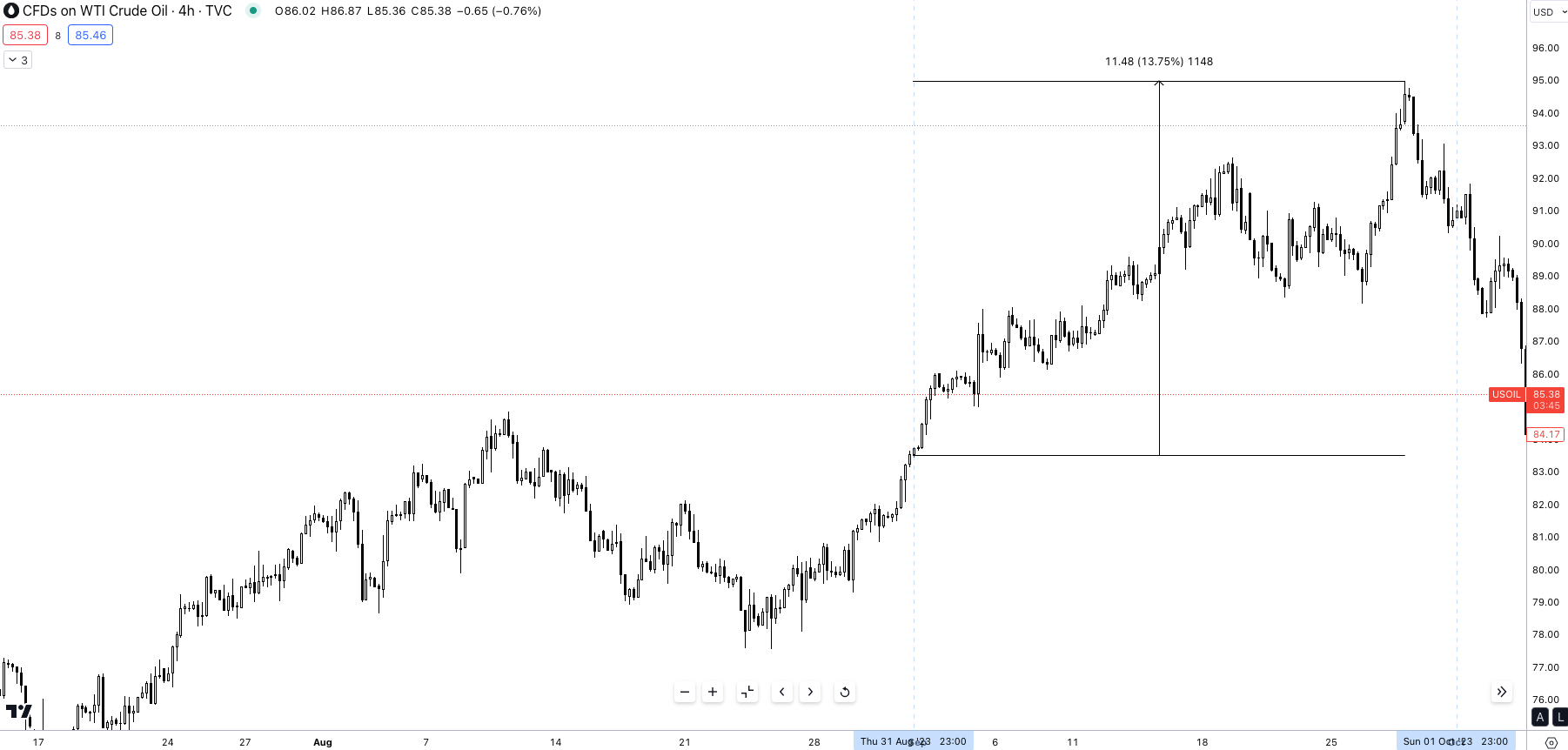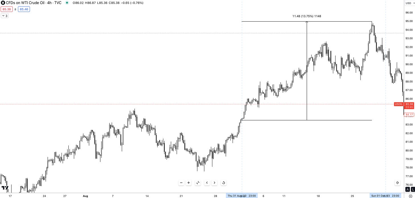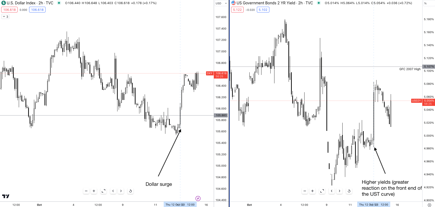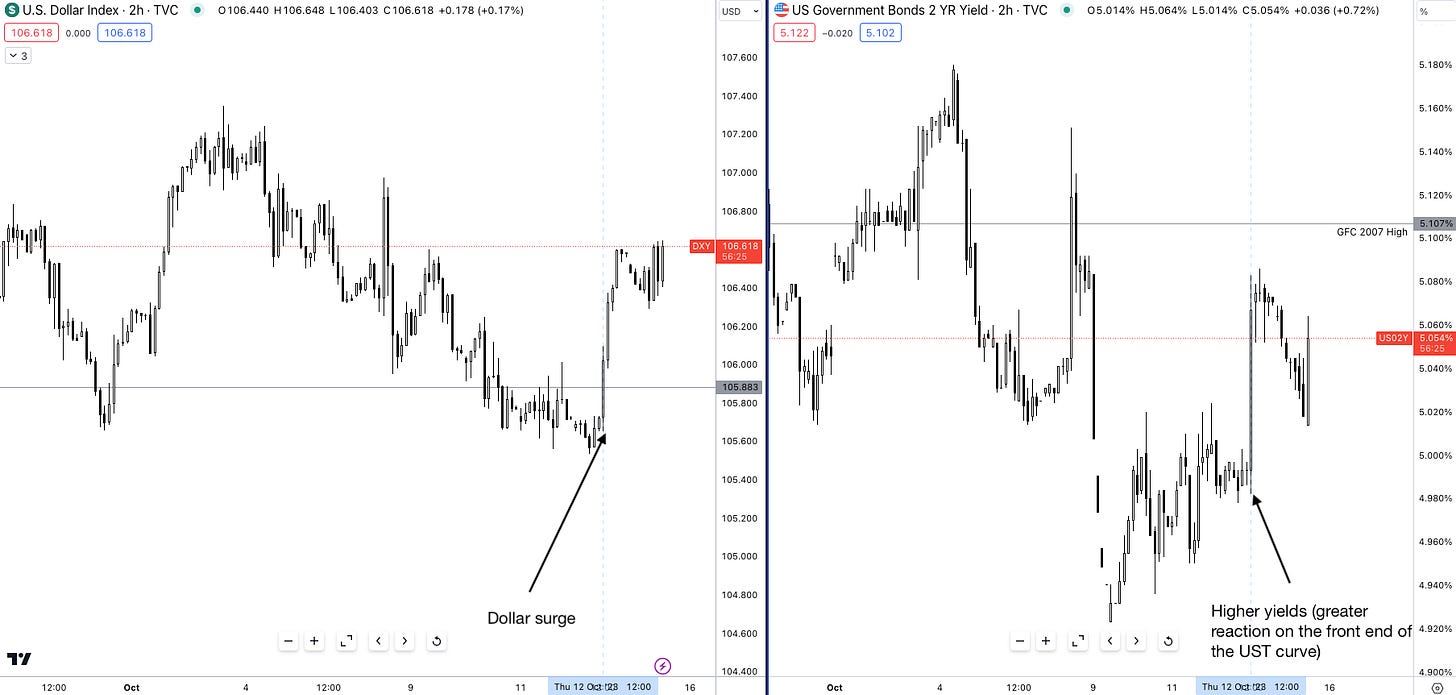 With this understanding in mind, when looking at how crude oil traded throughout September it’s clear as to why producer prices were more expensive. Oil peaked at $94.00 p/b, up 13.75% throughout the month of September. Now when we tie this back to CPI, PPI is a leading indicator for US CPI so the question arises, how would markets react to a hot CPI print?