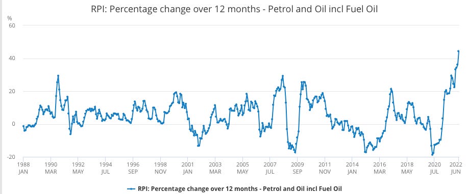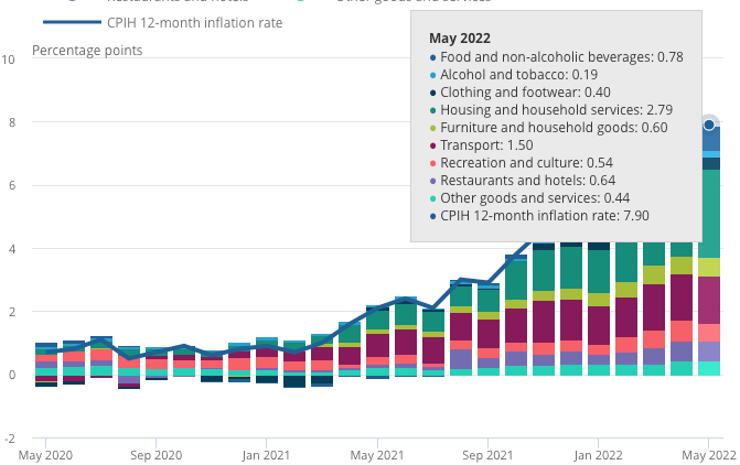 I know it’s pretty difficult to read with the massive data label but you understand the meaning when seeing inflation broken down, component by component. The biggest factor at play, you guessed it, household services (gas & electricity). Now you’re probably looking at transport thinking what’s the reason it’s added an extra 1.5% to the annual inflation rate, well the reason ties back into the elevated petrol costs we’re experiencing at the minute. Such changes have ripple effects that aren’t susceptible to only one sector but the wider scale economy.