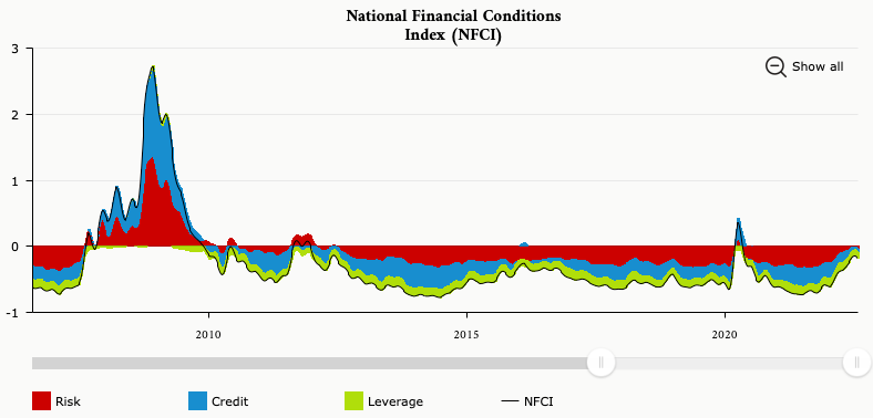 Now for a quick breakdown; the idea is that when the national financial conditions index is positive, as shown in 2008 & 2020, this is historically associated with tighter-than-average financial conditions. And for negative values historically this is associated with looser-than-average financial conditions.