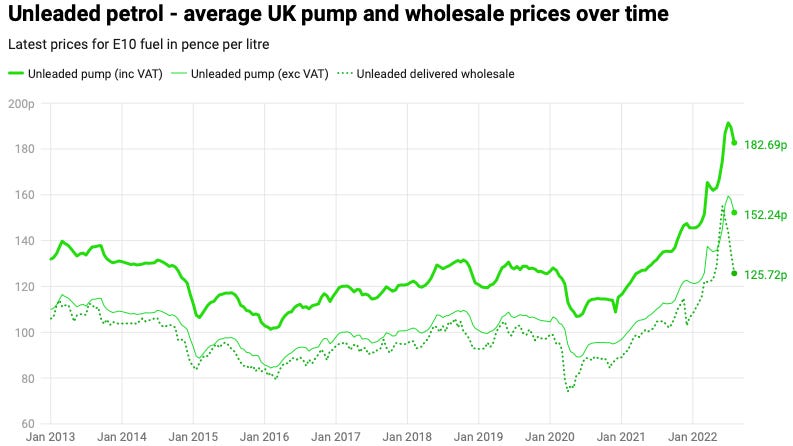 Historically we can say unleaded pump (the most popular form) has ranged between 110.00p - 131.00p. From the range highs of 131.00p until now unleaded pump prices are up 38.9%. That’s on the lower end… So from Jan ‘21 until now, petrol prices are up 56%.