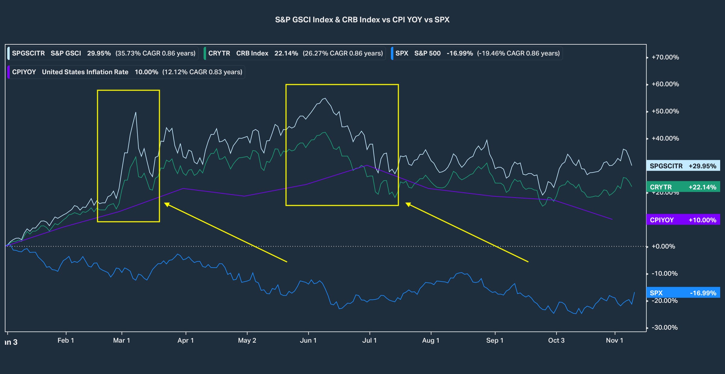 Whilst writing this up I took it one step further to compare U.S CPI YoY(consumer price index) against the S&P GSCI index (a benchmark for the commodity market), also the CRB index (a benchmark index for the commodity market) and finally the S&P 500. From Figure 3 you can see the near perfect correlation with both commodity index’s and the CPI rate of change throughout this year; during periods where commodities experienced serious price inflation CPI unsurprisingly followed suit.