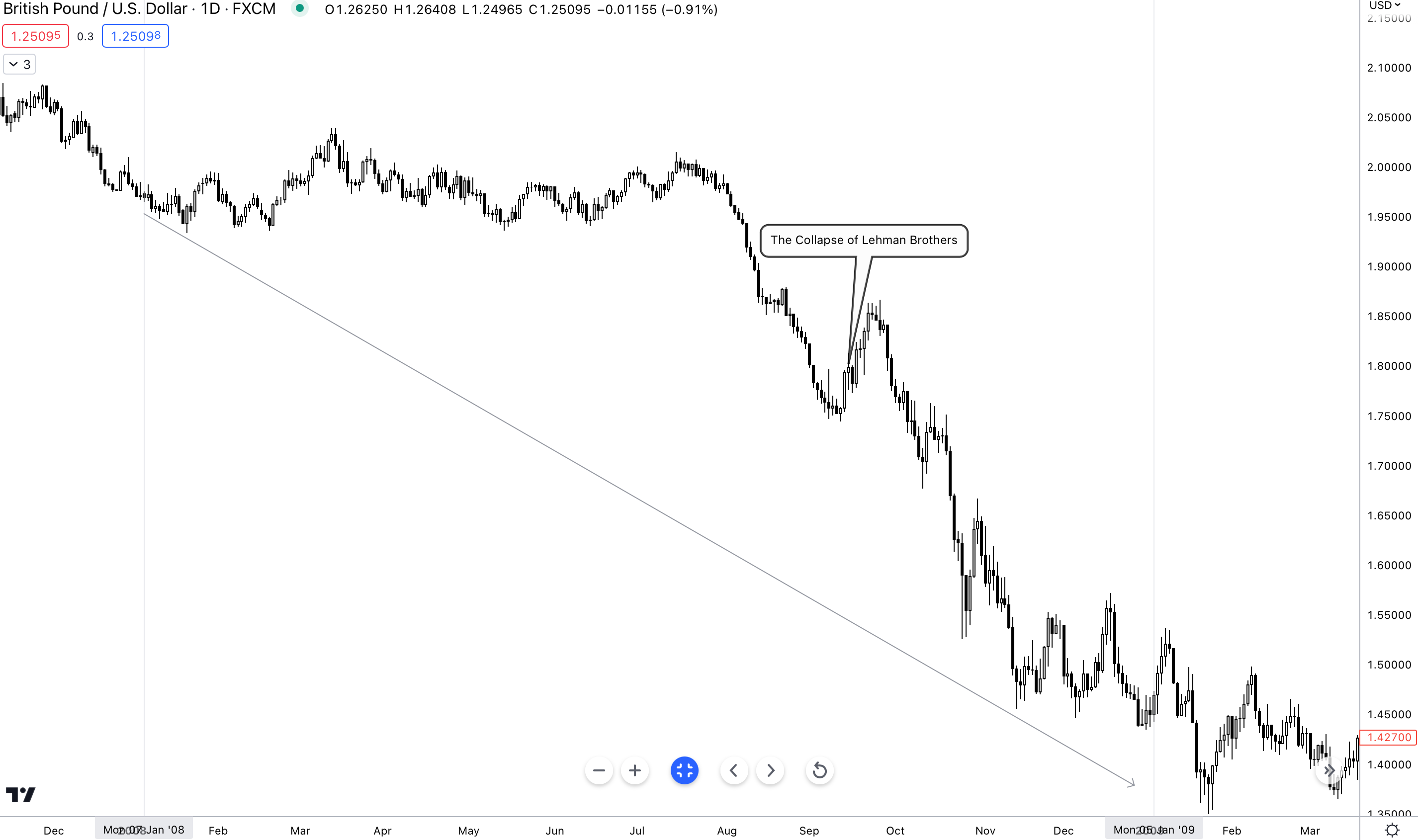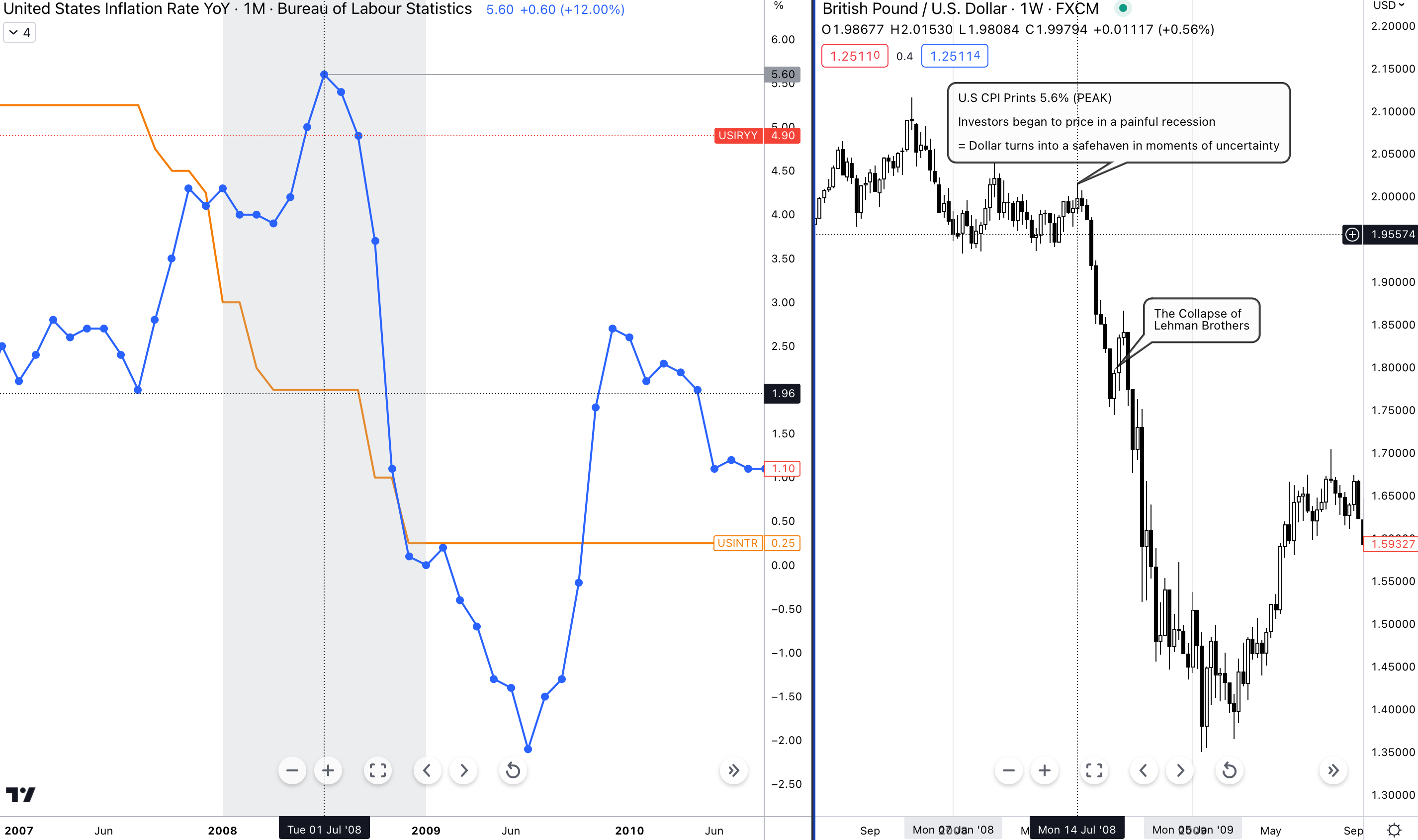 So, you can see that for GBP/USD, prior to the 2008 decline of 33%, factors such as a healthy labour market, high-interest rates, and a hawkish central bank all played in the UK’s favour leading the currency to worth 2.0000 vs the USD 0.00%↑ . However, once a recession was on the table, you can see that the only thing on investors' minds was capital preservation.