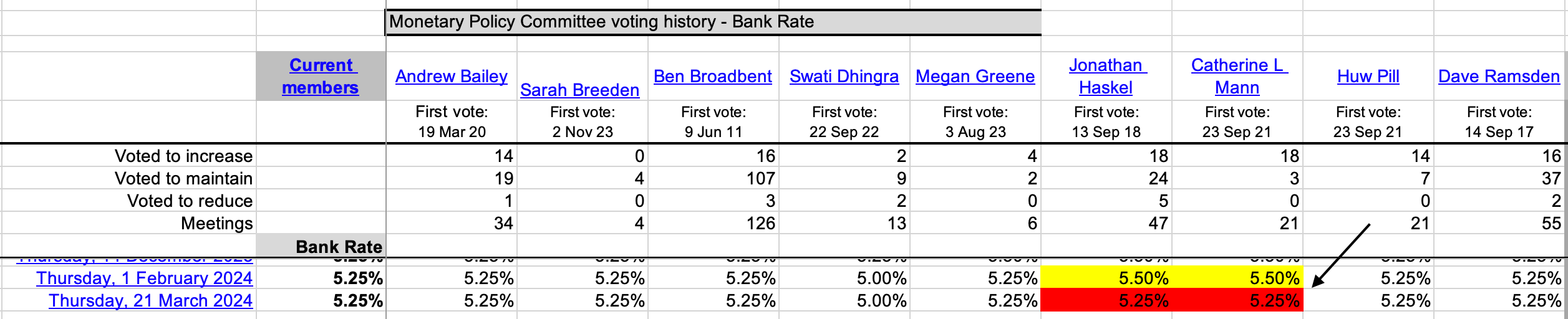 The MPC voted by a majority of 8-1 to maintain the Bank Rate at 5.25%, one member, Swati Dhingra, preferred to reduce the bank rate by 25bps to 5%, but most notably the two hawks Jonathan Haskel and Catherine Mann voted to maintain rates, a dovish tilt from their last vote to hike rates further as seen in Figure 6.