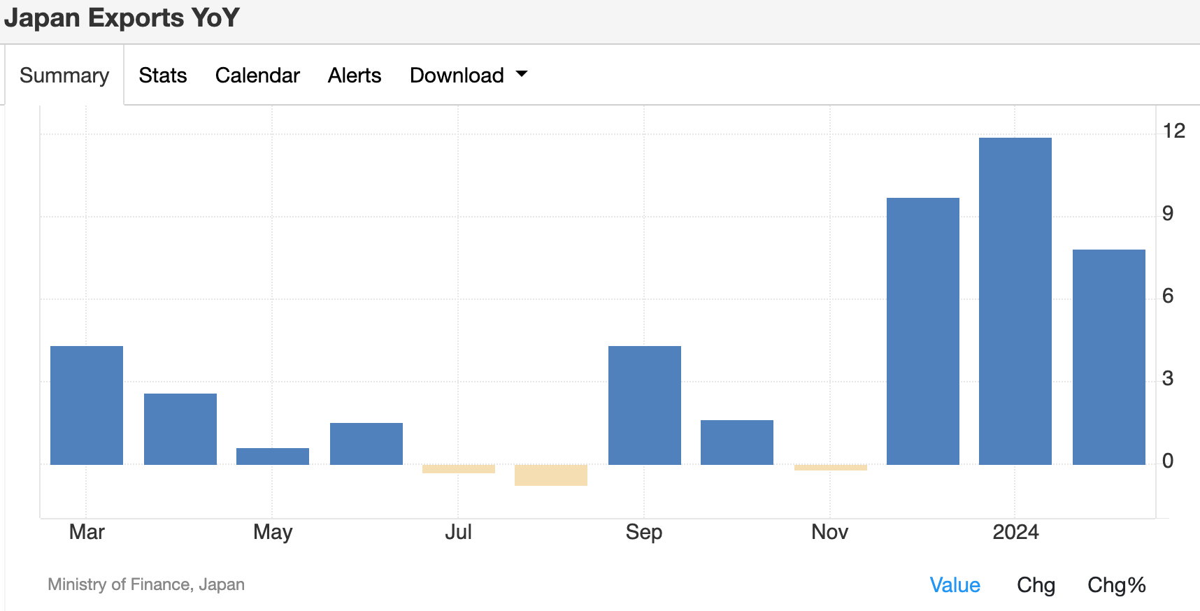 Japanese exports have exhibited a robust recovery since December 2023. Following a modest decline of 0.2% in November, exports surged to 9.7% year-on-year growth in December. This positive trend continued in February, driven by a significant 20.1% increase in transport equipment sales. Notably, demand for motor vehicles (up 19.8%) and cars (up 23.8%) within this category displayed strong gains.