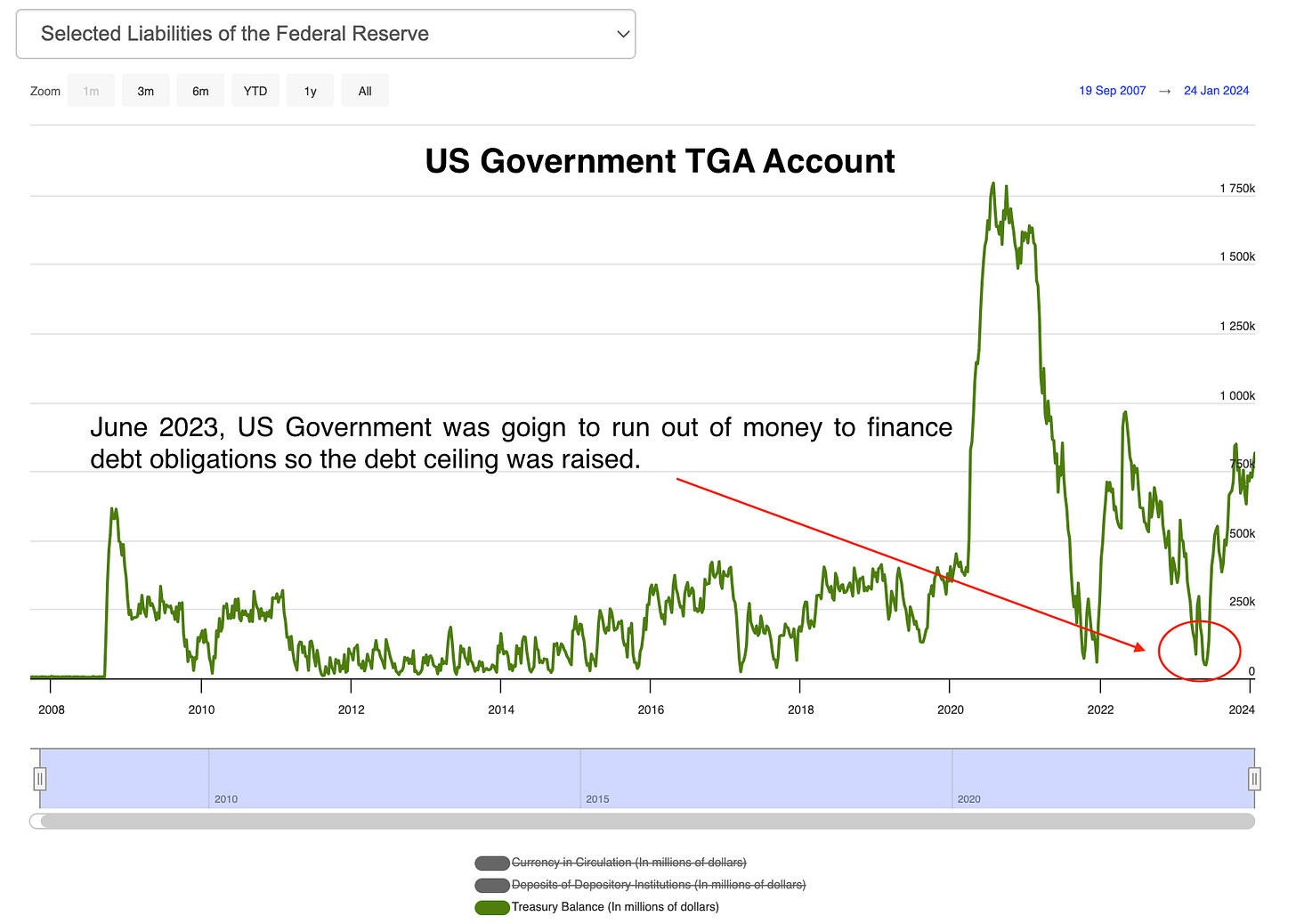 If you recall, the US government was in a predicament just over 8 months ago, in June 2023. The government had reached its debt limit and would default on its debt obligations as it had run the TGA balance to the lowest levels seen since 2018. This caused a short-term market route which resulted in the price across front-end bonds, particularly 1m-1year T-bills, as investors holding securities set to mature around the X date (default date) demanded higher yields for the increased volatility and risk. I was short the front end of the curve leading up to the X date.