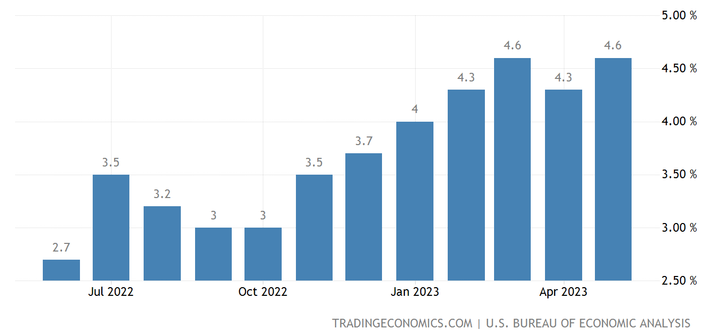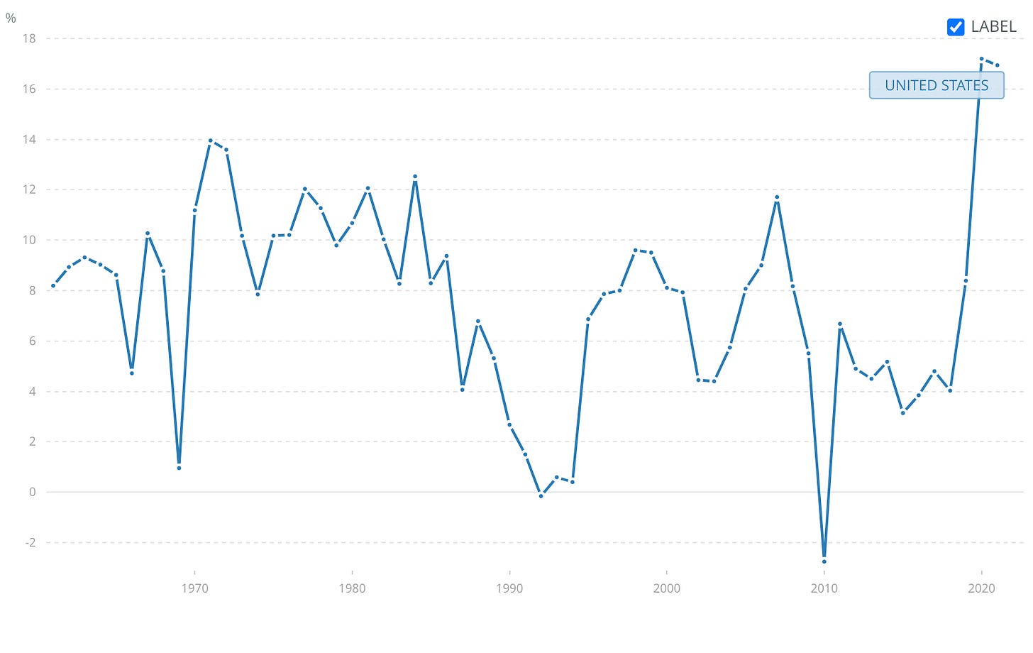 As you can imagine, if consumers are not spending, that means they’re not borrowing either, which plays a massive part in inflation. As a result, that translates into a contraction in the M2 annual % growth (money supply growth).