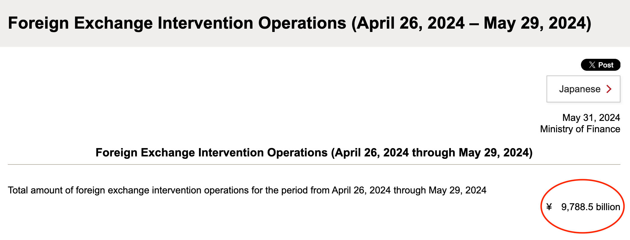 During the period April 26th to May 29th the MOF in Japan spent ¥9.7trillion on its currency intervention.
