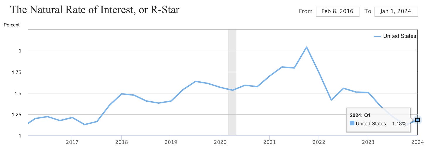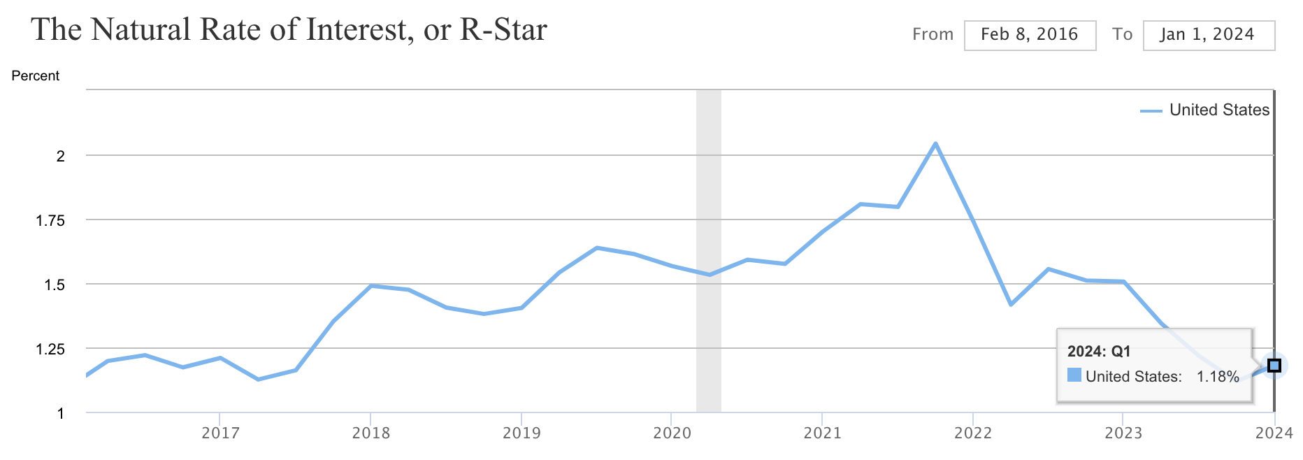 The one problem we face with r* is that it isn’t directly observable, while there are formulas, like the one above, which try to forecast r* it’s not a measurable data point, it’s one that must be concluded from analysing how the economy responds to different levels in short term interest rates.