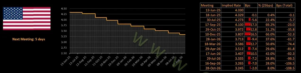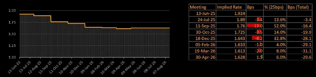 Overnight rate added c.8bps, pricing fully two (2) cuts by year-end.