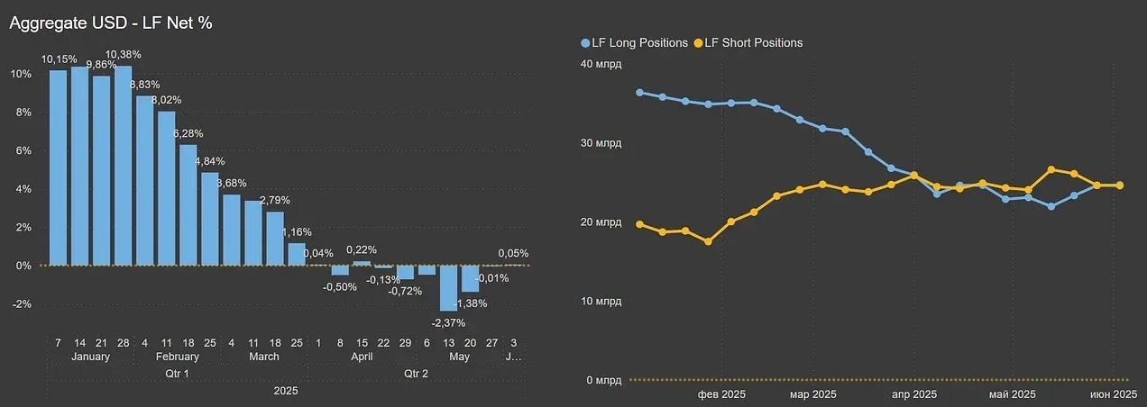 For the first time since the infamous liberation day, dollar positioning among leveraged funds has turned positive. However, for clarity’s sake, it would be impossible based on the totality of this book alone to deduce the net exposure, as it fails to account for hedges. Nevertheless, let's examine more closely. The first thing I would like to point out is that this appears to be more nuanced than the classic risk-off/on narrative.