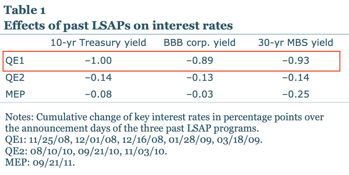 LSAP is an abbreviation for large-scale asset purchase. You can see that the Fed’s first QE program lowered yields on the US10Y yield by 1.00%, corporate yields by 0.89% and reduced the yield on 30y mortgages by 0.93%. This goes to show the depth and success this policy tool can have on financial conditions and borrowing costs; there’s one thing you may have already noticed however.