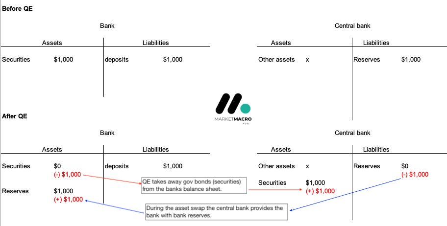 Let’s take a visual look at what happens to the composition of a central and commercial bank’s balance sheet after QE.