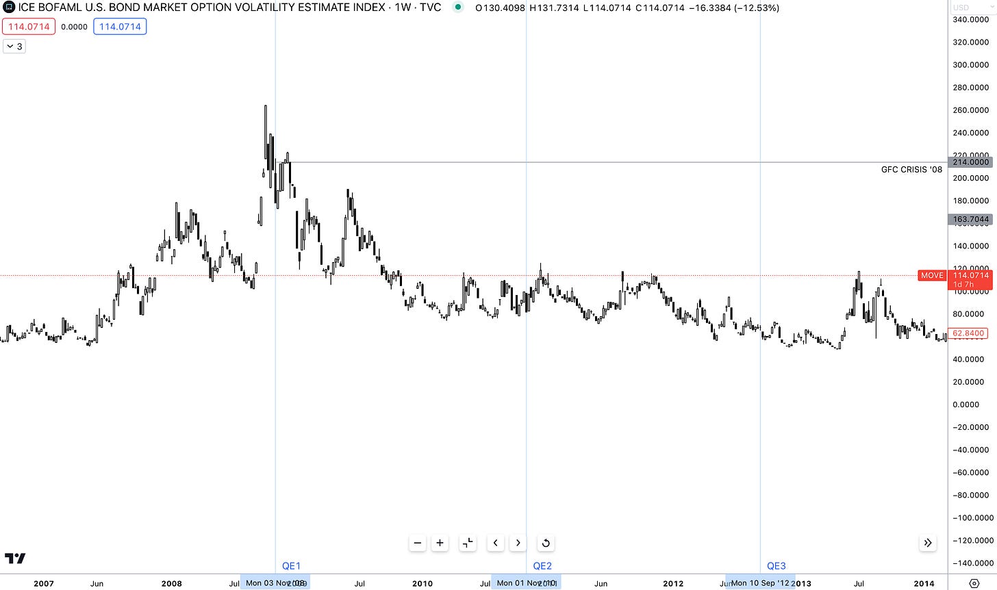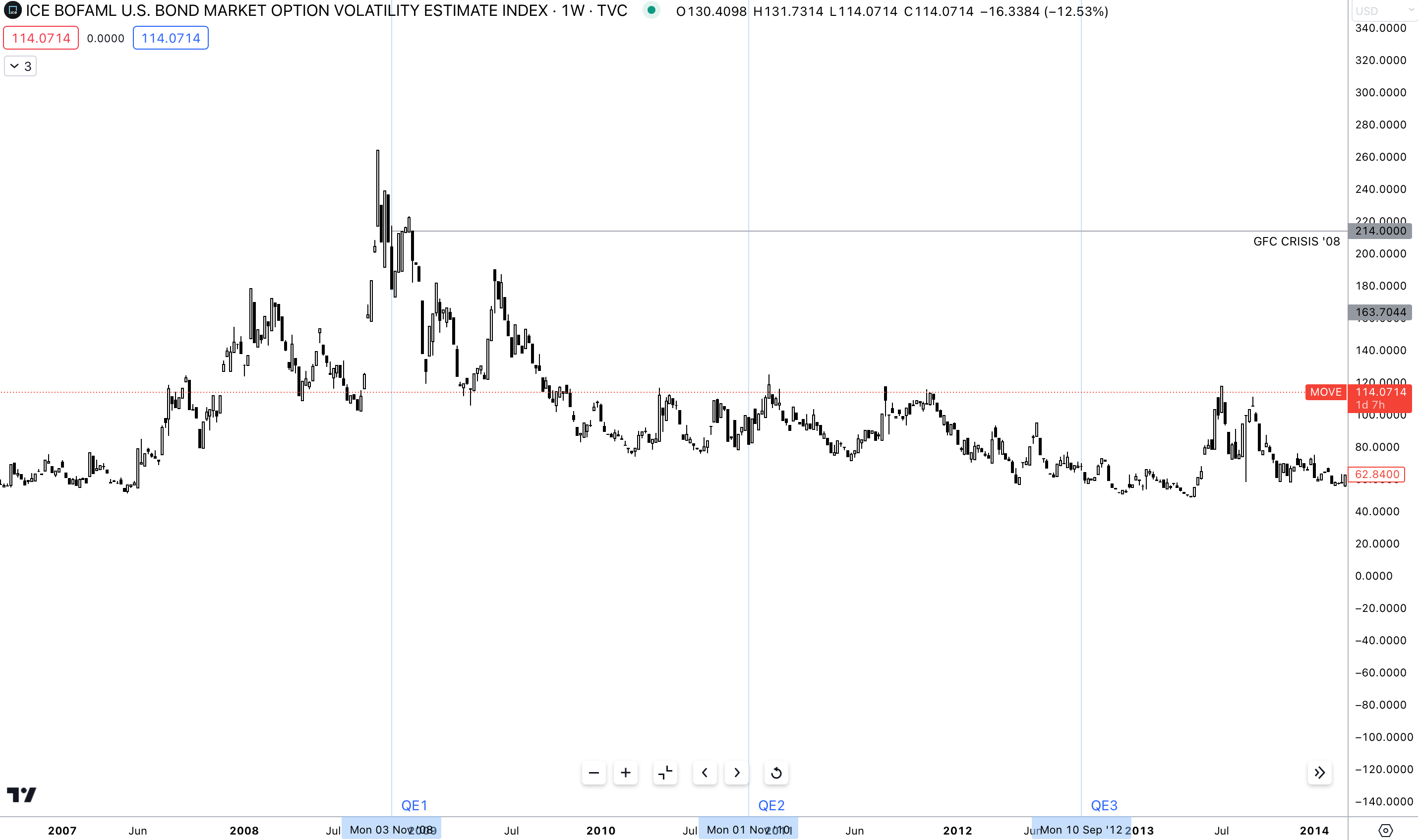 I’ve annotated each of the three different QE programs at the bottom of the chart. The reason why the successive QE programs didn’t lower yields like the first QE program is because of how high bond volatility was during the ‘08 crisis. It was the housing, mainly subprime, market that was under extreme heat during ‘08 so when the Fed initiated QE the result had a more dramatic effect simply because the market was in a period of increased fear and uncertainty, so the QE program brought stability back to markets.