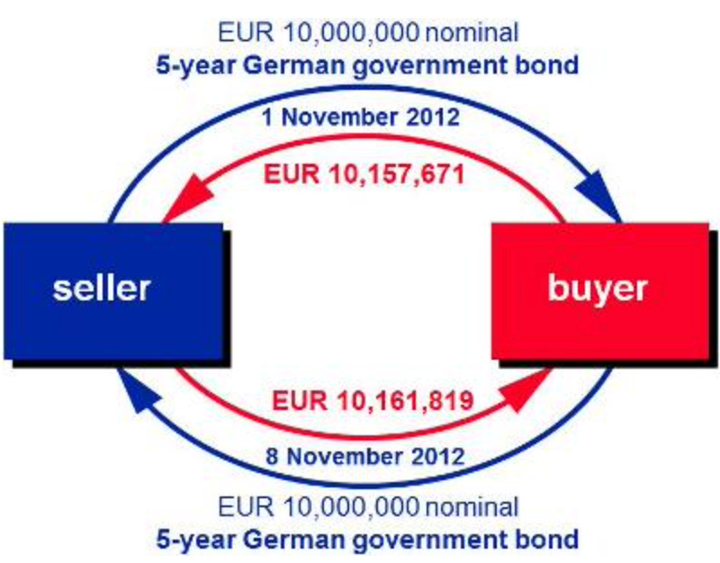 In the example, the interest charged for this short-term form of borrowing is the spread between the cost of the German bunds and what the borrower has to pay in order to repurchase the bunds. So the spread between the purchase and repurchase agreement is the interest charged.