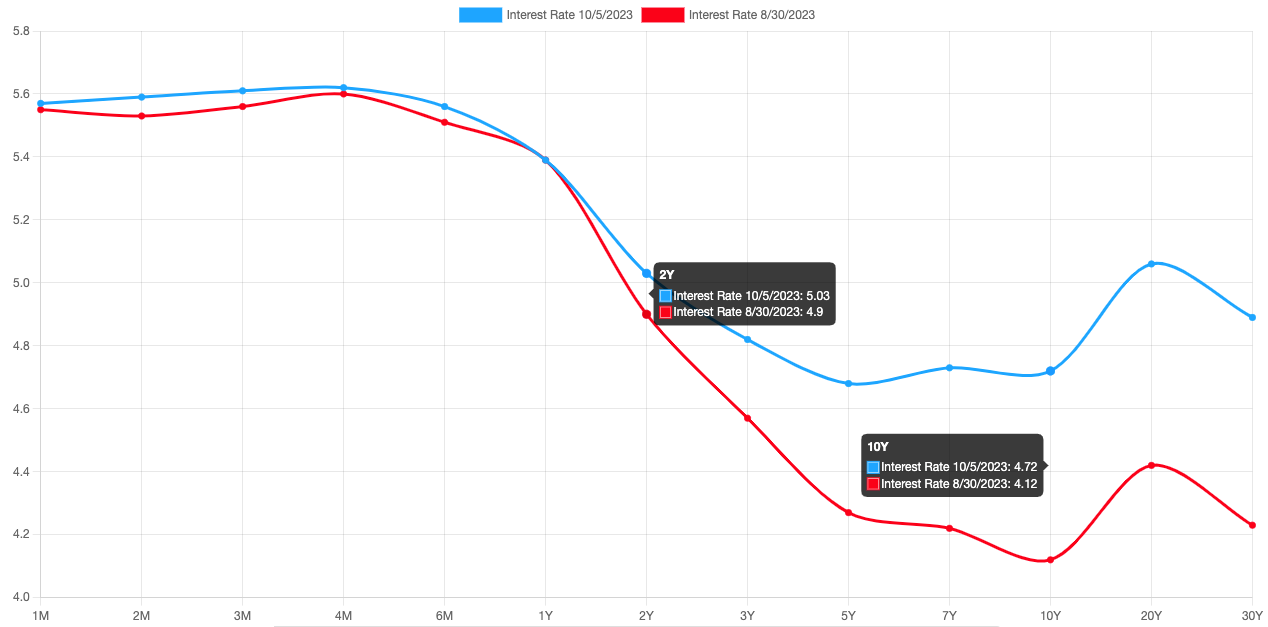 The red line represents the shape of the US yield curve at the start of September just a month ago, and the blue line is the yield curve as of yesterday. What can you see in short-end rates? Not much movement or steepening of yields, mainly due to the Fed coming to the end of the hiking cycle so additional rates aren’t being priced into the front end of the curve. On the other hand, when looking further out on the curve, the 10y, 20y and 30y there’s a huge spread between yields 1 month ago and today.