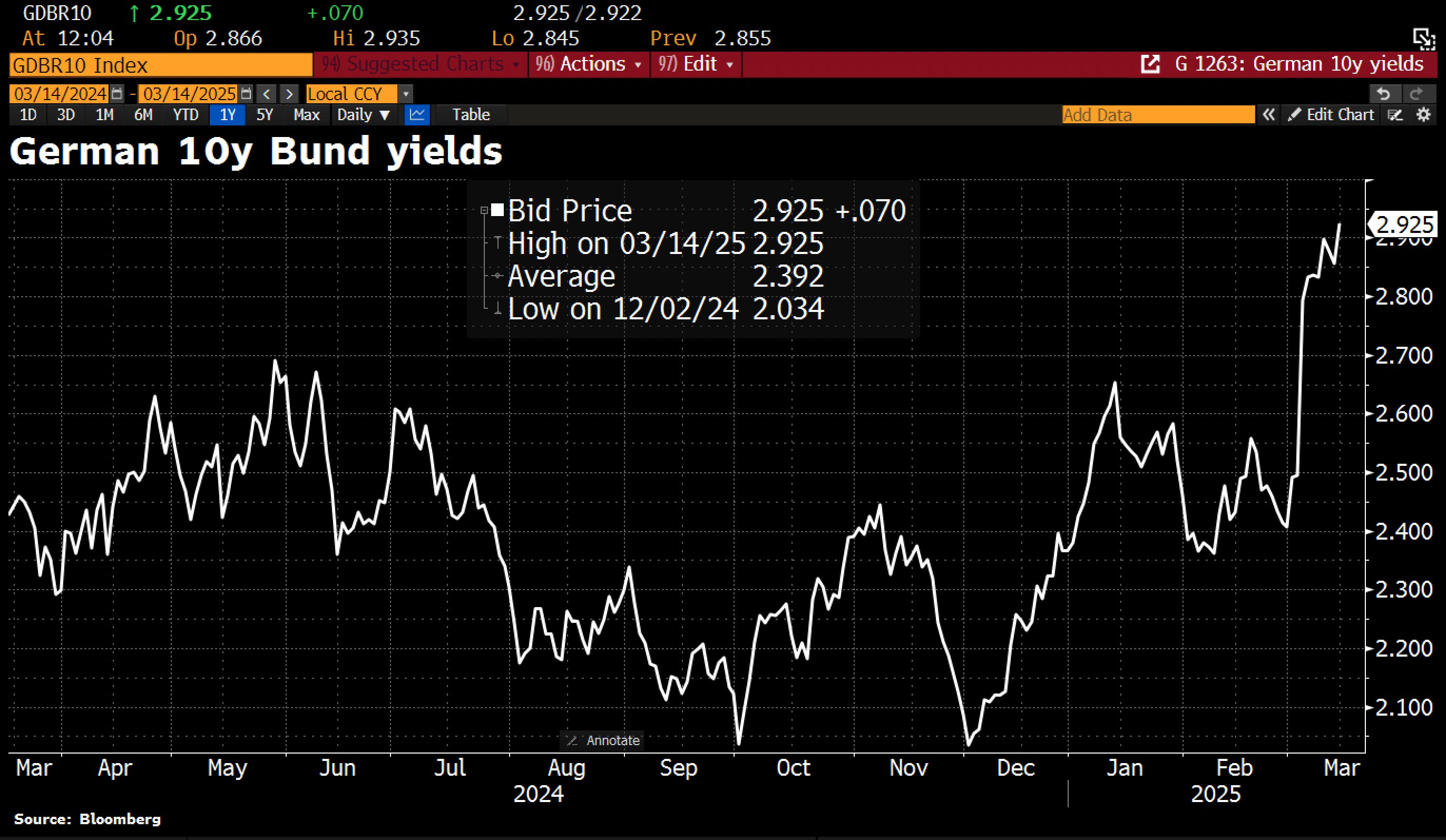 There was a small bump in the road when it came to Germany’s Merz and his plan to borrow c.€900bn for defence and infrastructure. The bump was from the Green Party (who will likely not be part of the next government coalition) when they announced that they’d oppose the defence spending plan and requested greater environmental guarantees. However, they soon backtracked and said they’d be open to negation, which re-sparked German Bund yields.