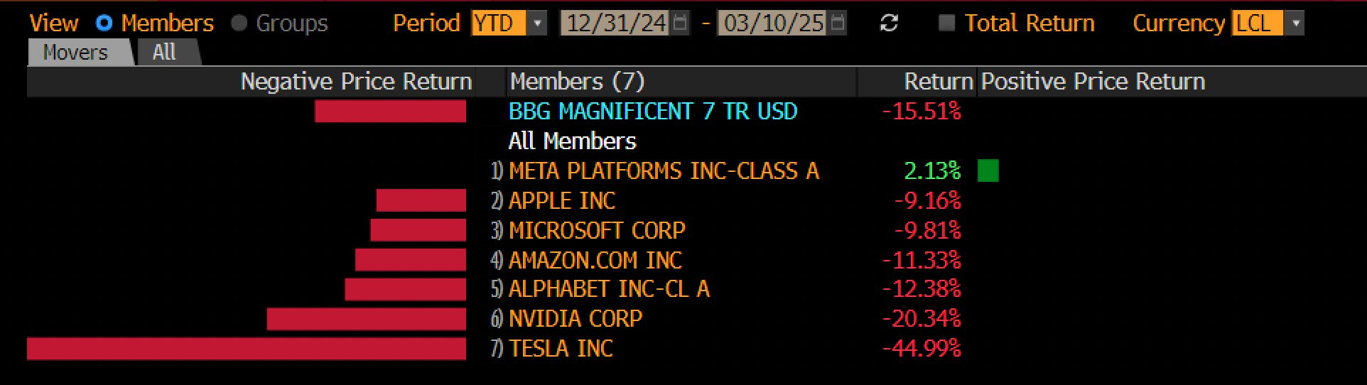 Only one of the Mag 7 stocks remains in positive territory this year, while the others have suffered significant losses. Tesla has declined 45% year-to-date. Concerns over tariffs and what they will do to U.S. equity has caused this large sell off. In times of uncertainty the biggest players want to be flat in positioning, the risk-off mood has really taken over.