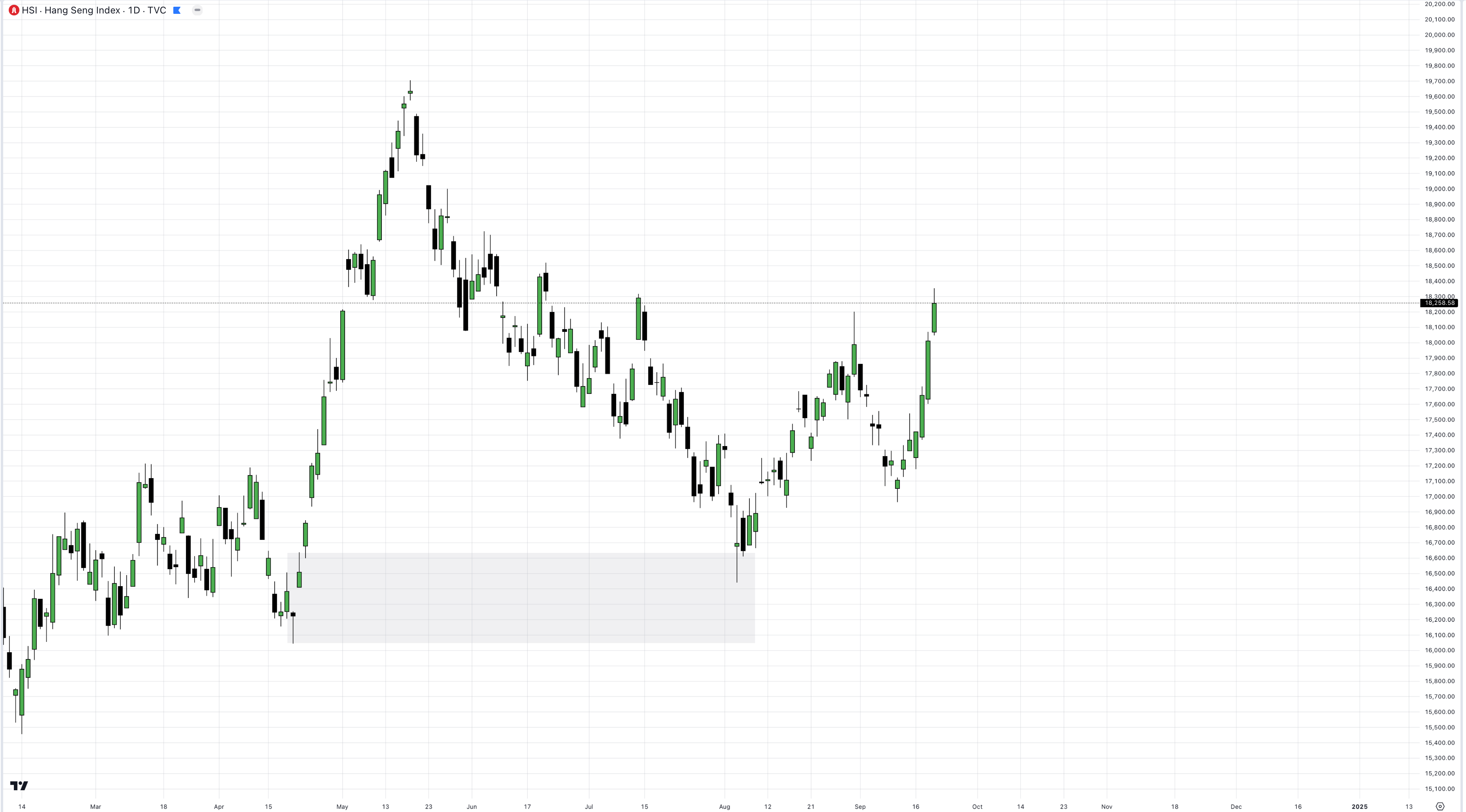Although this week has been filled with Chinese holidays, the driving factor for the HSI is most likely down to stimulus. Before the Golden Week holiday, there were signs that China’s central government might introduce more economic stimulus or supportive measures, such as cutting reserve requirements or lowering interest rates. Investors may have anticipated that after the holidays, these policies would be implemented, leading to an improved economic outlook for China.