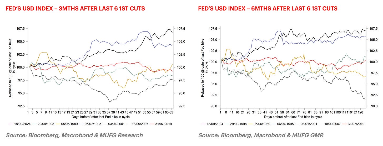 The two charts below illustrate the performance of the Fed's Advanced Economy USD Index over 3-month and 6-month periods after the initial rate cut in the last six Fed easing cycles. The Dollar's performance following the first rate cut has been mixed: in both the 3-month and 6-month intervals, the Dollar strengthened twice, remained nearly unchanged twice, and weakened twice. The reason for different outcomes is because of the different economic conditions that rates were cut in.