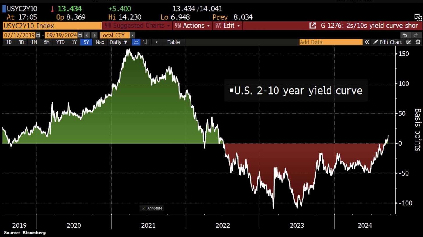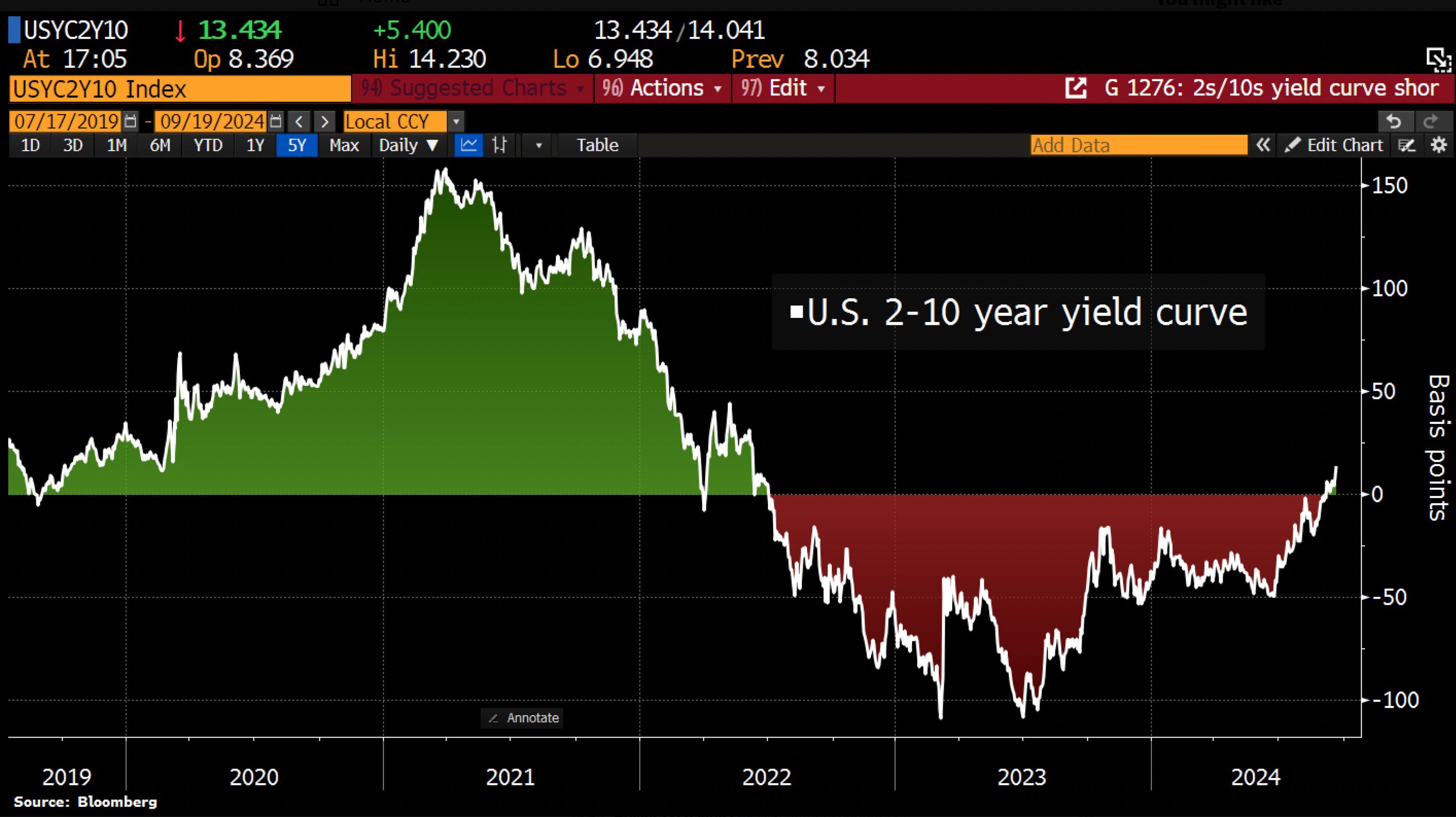 The Federal Reserve cut interest rates by 50bp in their meeting on Tuesday, which was c.63% priced into markets just moments before the meeting. Soft data made the rate cut fairly anticipated, pushing the 2s10s curve further into positive territory.
