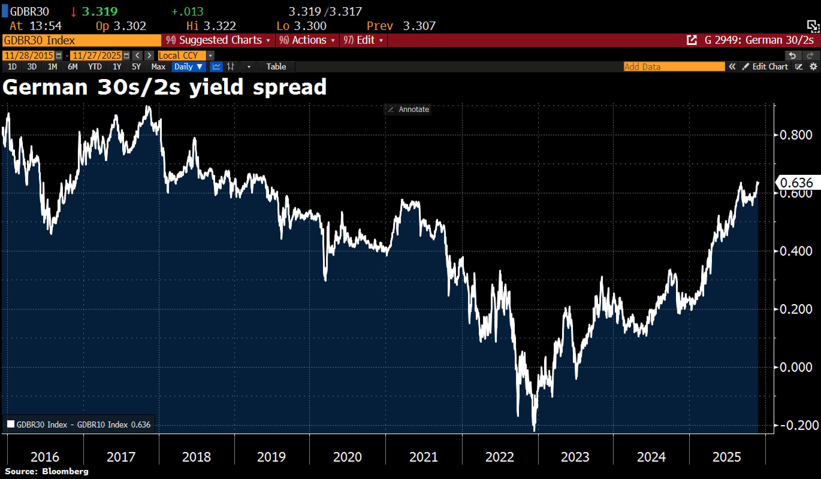 So why would the ECB avoid re hiking? The simple answer is that it would imply they got it wrong. Once you begin a cutting cycle, the bar to hike again becomes extremely high. The only situation where the ECB would consider re hiking is if inflation was re accelerating across the whole euro area, not just Germany. That is the fragmentation risk the eurozone always lives with. I do not think this is a real cause for concern. Germany’s inflation will likely continue to drift lower, but it is a tail risk I watch. Fragmentation matters. The 2s10s curve gives us the best read on policy expectations at the front end and growth expectations at the long end. It is pricing higher future inflation and growth, but crucially, it is not pricing a hawkish ECB that comes back with more hikes. That is good, because it is unlikely anyway.