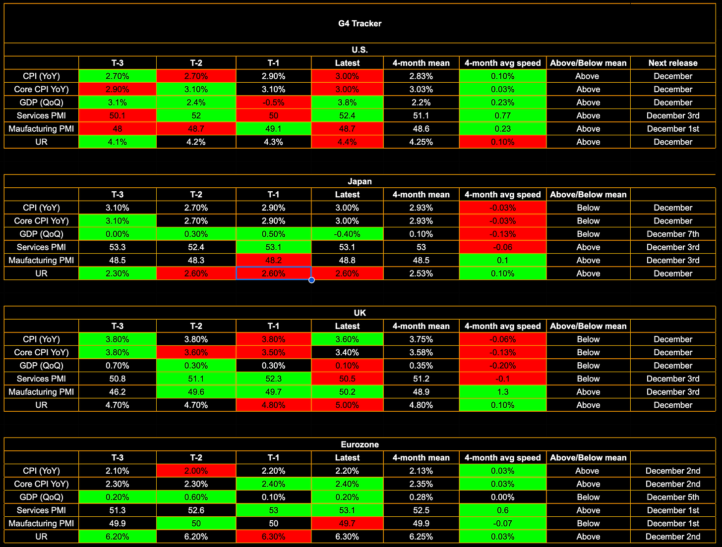 Across the pond, we have entered the Fed blackout window so I am not paying attention to speeches. What I am focused on is the November ADP report Wednesday, jobless claims Thursday and PCE Friday. We have seen just how reactive the Fed has been to labor data, even in the face of strong inflation, although inflation swaps and general inflation pressures have ticked down recently.