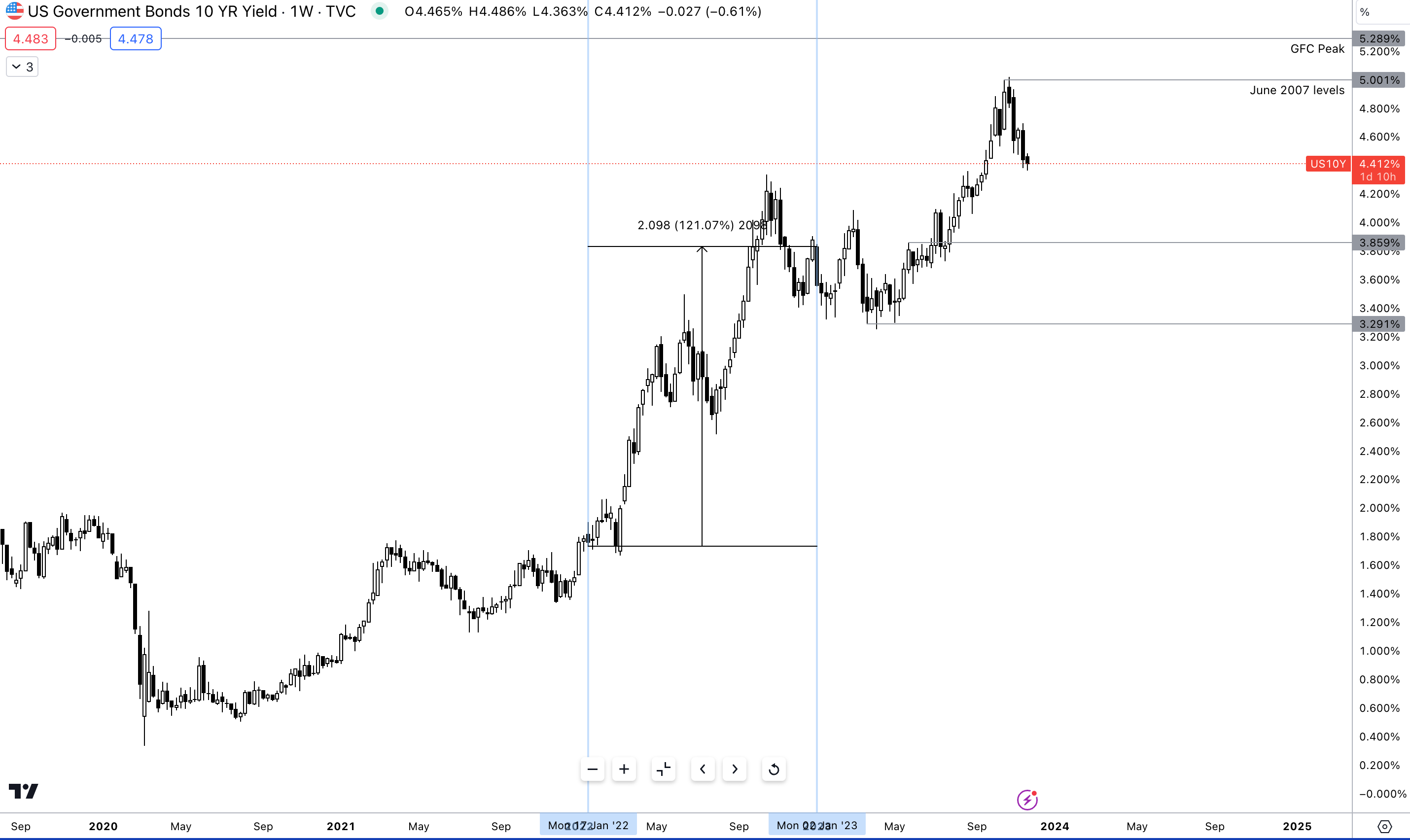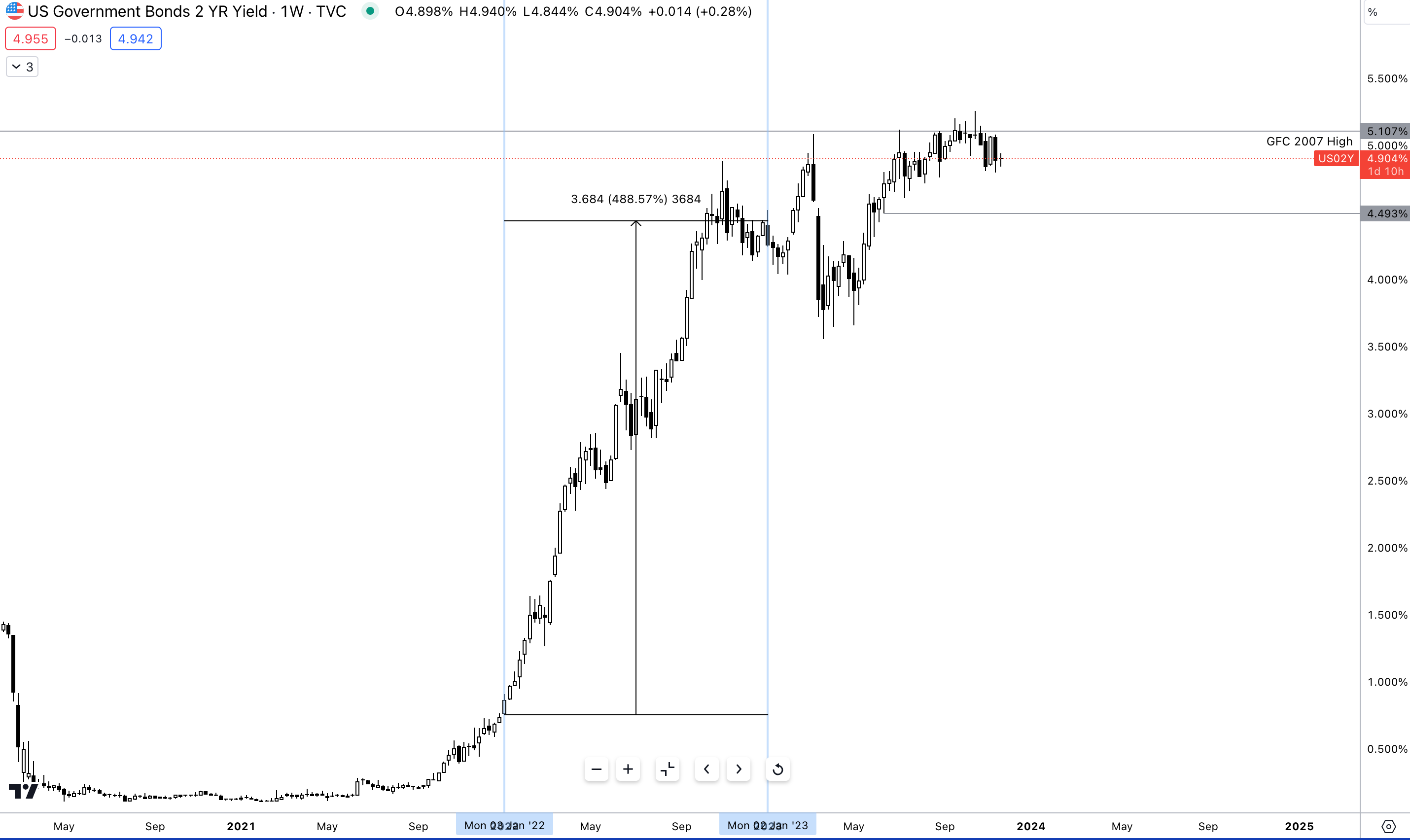 This sharp rally is a result of the Fed hike of 2022 which started in March. Comparing the move across short-dated bonds to long-end bonds you can see that the longer-maturity bonds showed a similar yet significantly smaller reaction to the US2y.